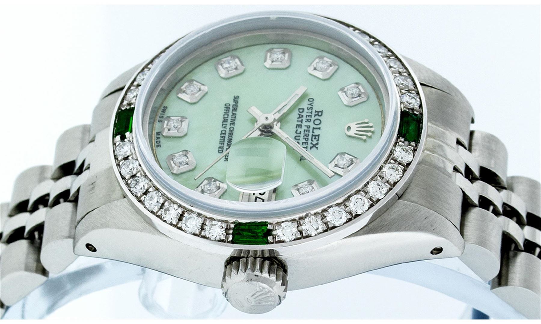Ladies Rolex Datejust Polished Bright with Satin Finish, Serviced & Electronically Tested, Stainless Steel Case:26mm, Stainless Steel Crown, Custom Bezel: 18K White Gold Emerald Beadset Diamond Bezel, Diamond + Gem Count: 28 Diamonds + 4 Emeralds Total Weight .70 Carat, Clarity: SI-VS, Color: G to H. Custom Crystal: Synthetic Sapphire Cyclops Lens. Movement: Automatic Winding Movement Caliber 2030. Custom Dial: Refinished Green Mother Of Pearl With Diamond Hour Markers. Date Window: 3 O'Clock Position Date Display, Model: Datejust Condition: G-6 Extra Fine. Bracelet:Stainless Steel Jubilee. Bright Polish & Satin Finish. 6.0 Inch Length, Adjustable. Standard Clasp, With Rolex Logo.