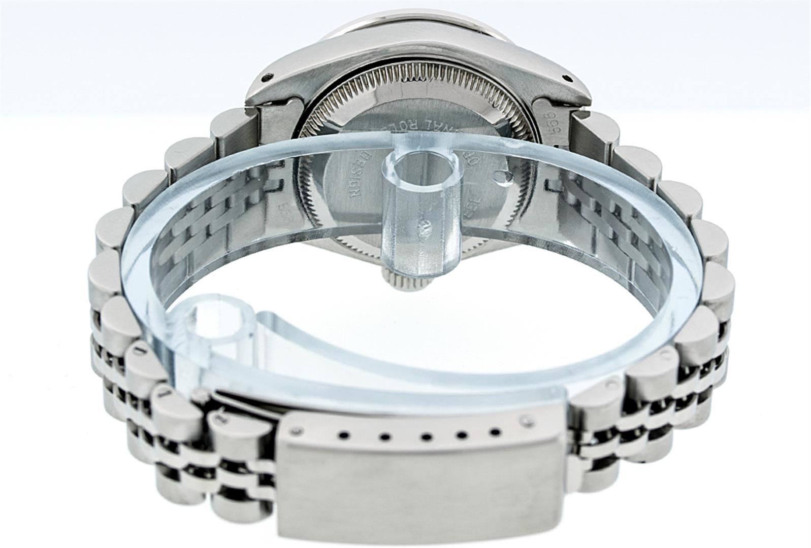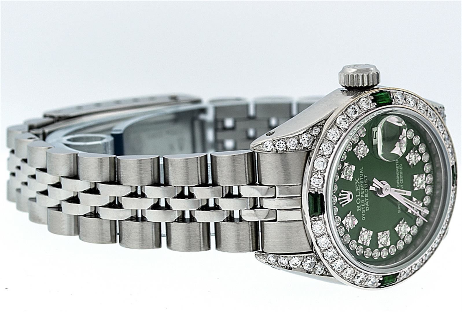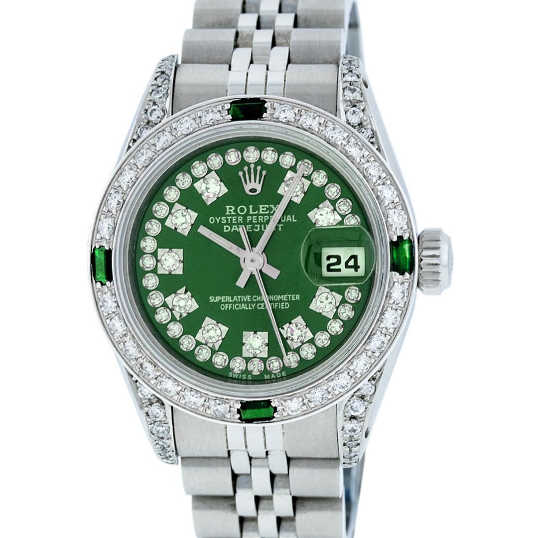 One Ladies Rolex Datejust Polished Bright with Satin Finish, Serviced & Electronically Tested, Stainless Steel Case:26mm, Stainless Steel Crown, Diamond Lugs: 16 Diamonds On Lugs, Clarity: SI-VS, Color: G to H. Custom Bezel: 18K White Gold Emerald Beadset Bezel, Diamond Count: 28 Diamonds + 4 Emeralds, Total Weight 1.00 Carat, Clarity: SI-VS, Color: G to H. Custom Crystal: Synthetic Sapphire Cyclops Lens. Movement: Automatic Winding Movement Caliber 2030. Custom Dial: Refinished Green With String Diamond Dial, 43 Diamonds in Dial G To H In Color, Clarity: VVS. Date Window: 3 O'Clock Position Date Display, Model: Datejust Condition: G-6 Extra Fine. Bracelet: Stainless Steel Jubilee. Bright Polish & Satin Finish. 6.0 Inch Length, Adjustable. Standard Clasp, With Rolex Logo.