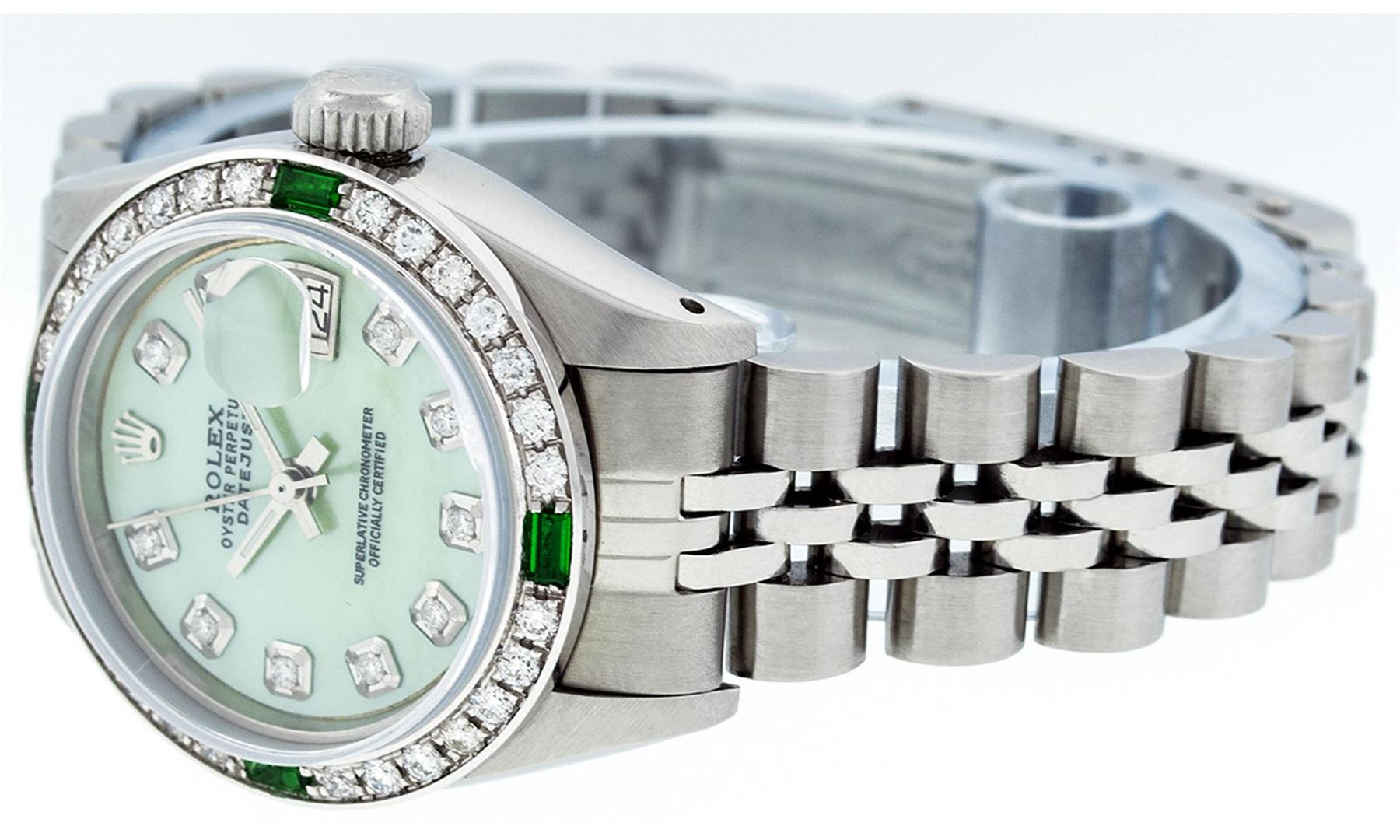 Ladies Rolex Datejust Polished Bright with Satin Finish, Serviced & Electronically Tested, Stainless Steel Case:26mm, Stainless Steel Crown, Custom Bezel: 18K White Gold Emerald Beadset Diamond Bezel, Diamond + Gem Count: 28 Diamonds + 4 Emeralds Total Weight .70 Carat, Clarity: SI-VS, Color: G to H. Custom Crystal: Synthetic Sapphire Cyclops Lens. Movement: Automatic Winding Movement Caliber 2030. Custom Dial: Refinished Green Mother Of Pearl With Diamond Hour Markers. Date Window: 3 O'Clock Position Date Display, Model: Datejust Condition: G-6 Extra Fine. Bracelet:Stainless Steel Jubilee. Bright Polish & Satin Finish. 6.0 Inch Length, Adjustable. Standard Clasp, With Rolex Logo.