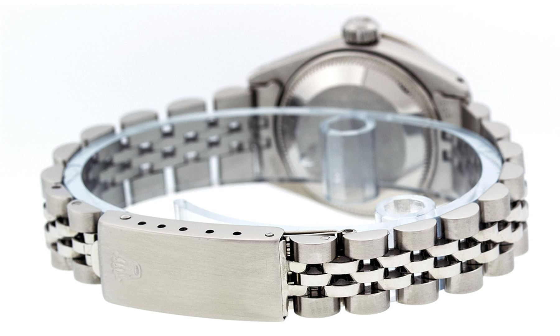 Ladies Rolex Datejust Polished Bright with Satin Finish, Serviced & Electronically Tested, Stainless Steel Case:26mm, Stainless Steel Crown, Custom Bezel: 18K White Gold Emerald Beadset Diamond Bezel, Diamond + Gem Count: 28 Diamonds + 4 Emerald. Total Weight .70 Carat, Clarity: SI-VS, Color: G to H. Custom Crystal: Synthetic Sapphire Cyclops Lens. Movement: Automatic Winding Movement Caliber 2030. Custom Dial: Refinished Pink With Diamond Hour Markers. Diamond Count: 10 Diamonds, Color: G To H, Clarity: SI-VS. Date Window: 3 O'Clock Position Date Display, Model: Datejust. Condition: G-6 Extra Fine. Bracelet: Stainless Steel Jubilee. Bright Polish & Satin Finish. 6.0 Inch Length, Adjustable. Standard Clasp, With Rolex Logo.