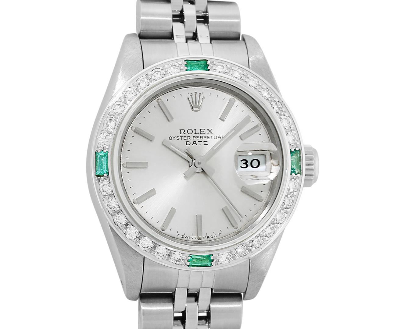 One Ladies Pre Owned Quickset Stainless Steel Rolex Datejust Polished Bright with Satin Finish, Serviced & Electronically Tested, Rolex Stainless Steel Case: 26mm, Rolex Stainless Steel Crown, Custom Bezel: 18K White Gold Beadset Emerald Bezel, Stone Count: 28 Diamonds + 4 Emeralds, Diamond Color: G To H, Clarity: SI-VS. Custom Crystal: New Sapphire With Magnified Date Window. Custom Hands: New Luminescent Hands. Rolex Movement: Quickset Automatic Winding Movement 2130. Rolex Dial: Silver Index Dial With Luminescent Dots & Dash Track. Date Window: 3 O'Clock Position Date Display, Model: Sapphire Quickset Datejust. Condition: G-6 Extra Fine. Rolex Bracelet: Stainless Steel Jubilee Band. Bright Polish & Satin Finish. 6.0 Inch Length, Adjustable. Standard Clasp, With Rolex Logo. This Watch Has Been Serviced Time Tested And Is In Excellent Condition It Is Free Of All Scratches And Dents.