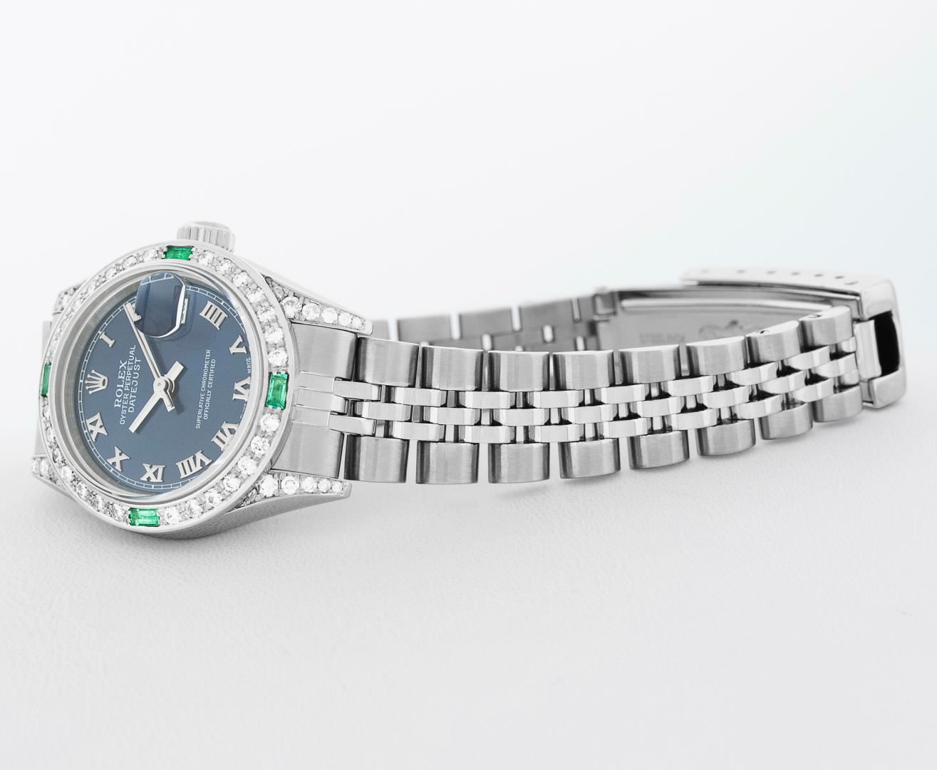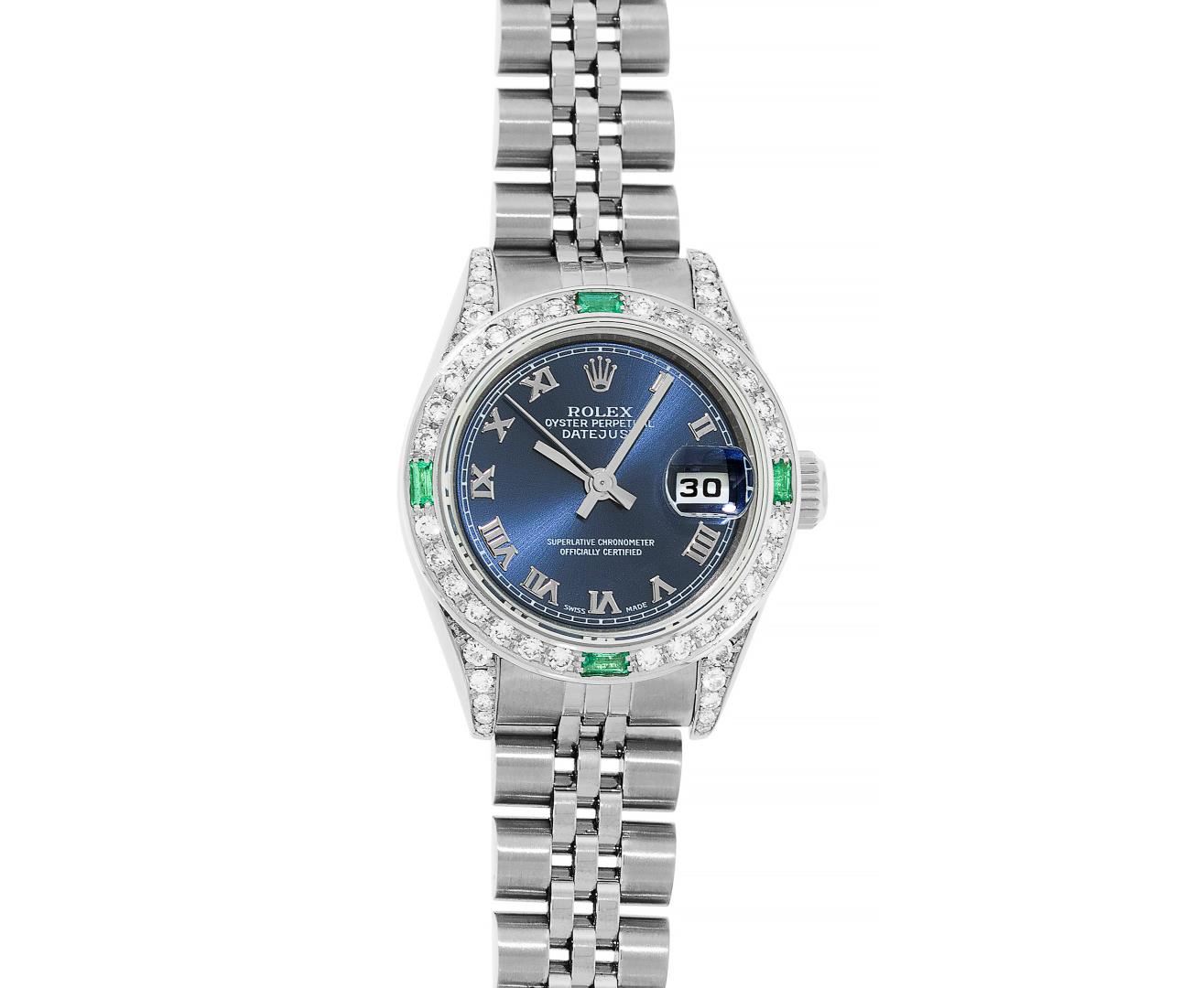 One Ladies Pre Owned Quickset Stainless Steel Rolex Datejust Polished Bright with Satin Finish, Serviced & Electronically Tested, Rolex Stainless Steel Case: 26mm, Custom Diamond Lugs: Added Diamonds On Lugs, Diamond Count: 24 Diamonds On Bezel, Color: G To H, Clarity: SI-VS. Rolex Stainless Steel Crown, Custom Bezel: New 18K White Gold Beadset And Emerald Bezel, Stone Count: 28 Diamonds + 4 Emeralds, Diamond Color: G To H, Clarity: SI-VS. Custom Crystal: New Sapphire With Magnified Date Window. Custom Hands: New Hands. Rolex Movement: Quickset Automatic Winding Movement 2230. Rolex Dial: Blue Roman Dial With Square Track. Date Window: 3 O'Clock Position Date Display, Model: Sapphire Quickset Datejust. Condition: G-6 Extra Fine. Rolex Bracelet: Stainless Steel Jubilee Band. Bright Polish & Satin Finish. 6.0 Inch Length, Adjustable. Standard Clasp, With Rolex Logo. This Watch Has Been Serviced Time Tested And Is In Excellent Condition It Is Free Of All Scratches And Dents.
