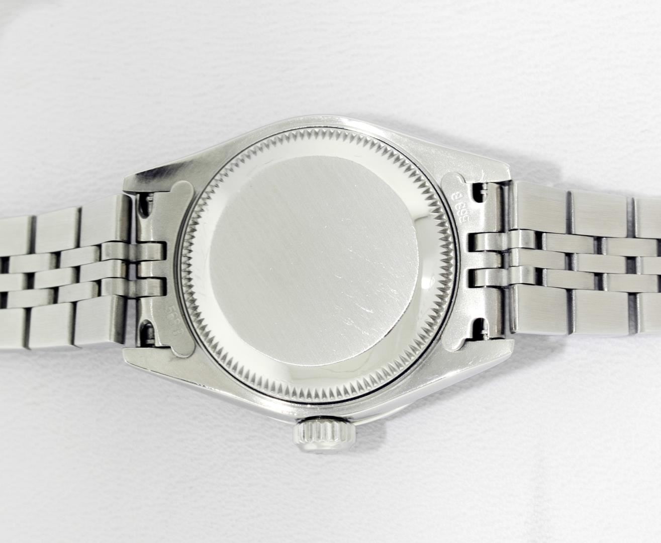 One Ladies Pre Owned Quickset Stainless Steel Rolex Datejust Polished Bright with Satin Finish, Serviced & Electronically Tested, Rolex Stainless Steel Case: 26mm, Custom Diamond Lugs: Added Diamonds On Lugs, Diamond Count: 24 Diamonds On Bezel, Color: G To H, Clarity: SI-VS. Rolex Stainless Steel Crown, Custom Bezel: New 18K White Gold Beadset And Emerald Bezel, Stone Count: 28 Diamonds + 4 Emeralds, Diamond Color: G To H, Clarity: SI-VS. Custom Crystal: New Sapphire With Magnified Date Window. Custom Hands: New Lumi Hands. Rolex Movement: Quickset Automatic Winding Movement 2230. Rolex Dial: Silver Index With Dash Track And Lumi Dots. Date Window: 3 O'Clock Position Date Display, Model: Sapphire Quickset Datejust. Condition: G-6 Extra Fine. Rolex Bracelet: Stainless Steel Jubilee Band. Bright Polish & Satin Finish. 6.0 Inch Length, Adjustable. Standard Clasp, With Rolex Logo. This Watch Has Been Serviced Time Tested And Is In Excellent Condition It Is Free Of All Scratches And Dents.