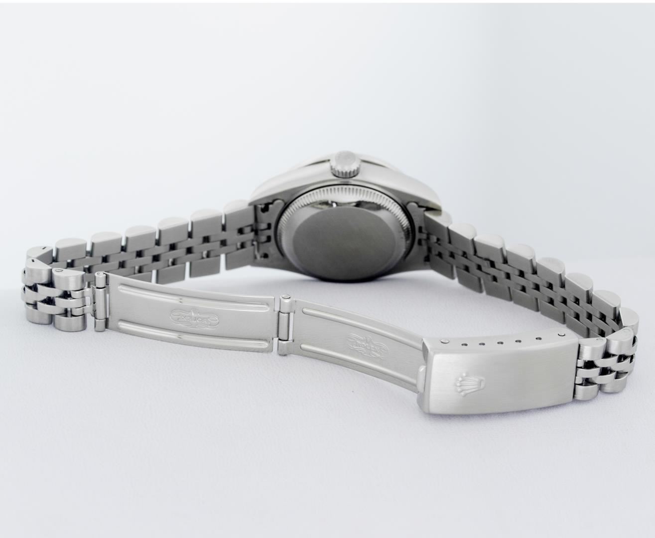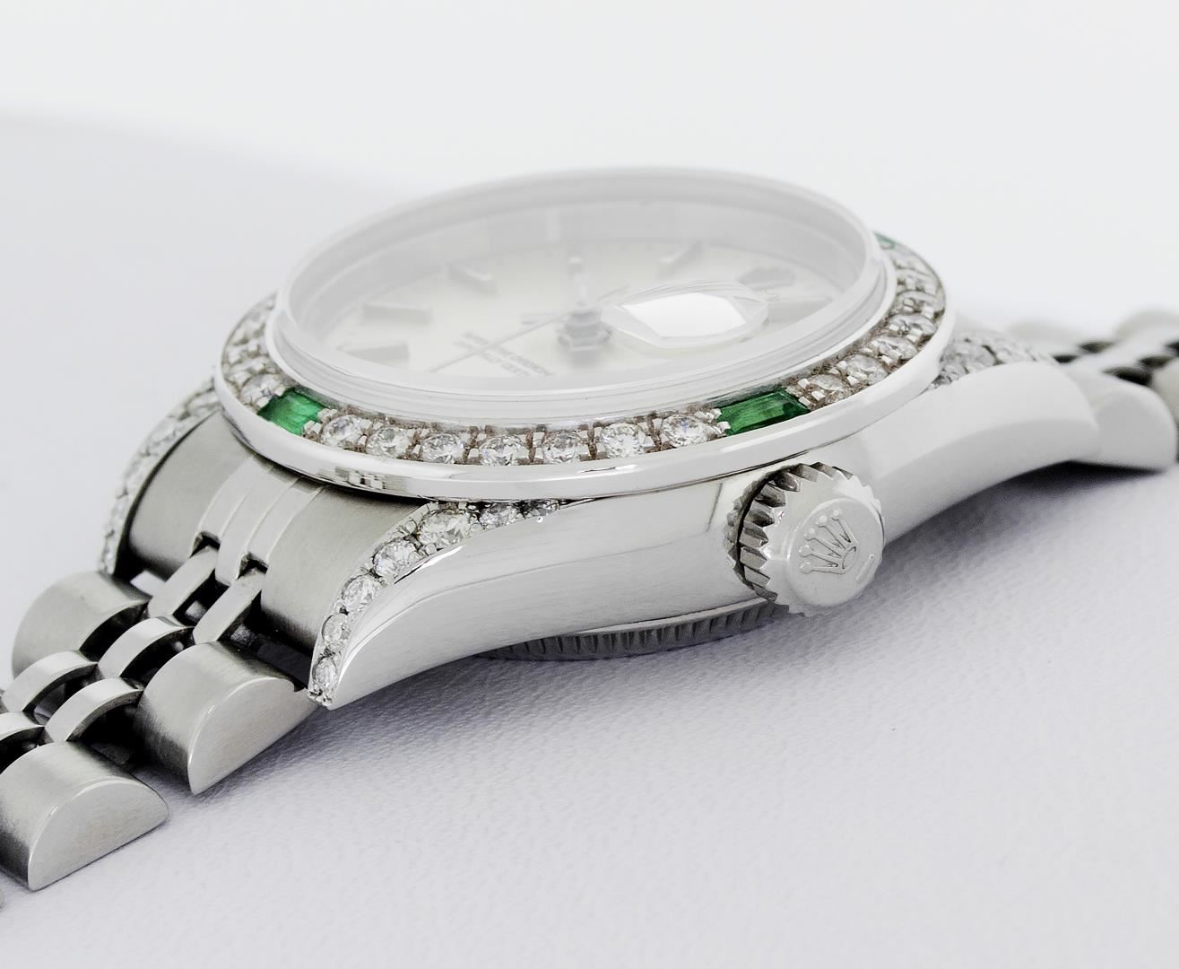One Ladies Pre Owned Quickset Stainless Steel Rolex Datejust Polished Bright with Satin Finish, Serviced & Electronically Tested, Rolex Stainless Steel Case: 26mm, Custom Diamond Lugs: Added Diamonds On Lugs, Diamond Count: 24 Diamonds On Bezel, Color: G To H, Clarity: SI-VS. Rolex Stainless Steel Crown, Custom Bezel: New 18K White Gold Beadset And Emerald Bezel, Stone Count: 28 Diamonds + 4 Emeralds, Diamond Color: G To H, Clarity: SI-VS. Custom Crystal: New Sapphire With Magnified Date Window. Custom Hands: New Lumi Hands. Rolex Movement: Quickset Automatic Winding Movement 2230. Rolex Dial: Silver Index With Dash Track And Lumi Dots. Date Window: 3 O'Clock Position Date Display, Model: Sapphire Quickset Datejust. Condition: G-6 Extra Fine. Rolex Bracelet: Stainless Steel Jubilee Band. Bright Polish & Satin Finish. 6.0 Inch Length, Adjustable. Standard Clasp, With Rolex Logo. This Watch Has Been Serviced Time Tested And Is In Excellent Condition It Is Free Of All Scratches And Dents.