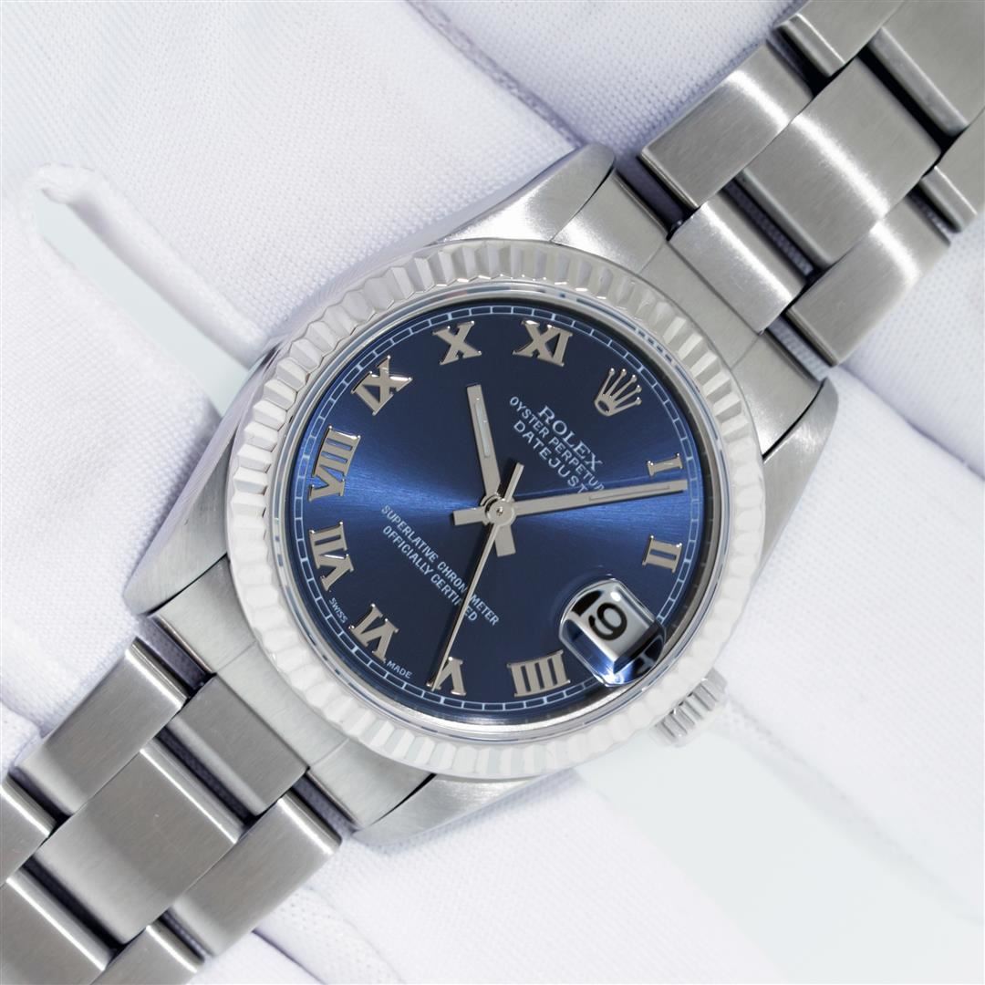One Women's Pre Owned Midsize Stainless Steel Rolex Datejust Polished, Serviced & Electronically Tested, Rolex Stainless Steel case: 31mm, Rolex Stainless Steel Crown, Rolex Bezel: 18K White Gold Fluted Bezel, Crystal: Sapphire with Cyclops Lens. Hands: Lumi Hands. Rolex Movement: Automatic Winding Movement. Rolex Dial: Factory Blue Roman with Index Hour Markers. Date Window: 3 O'Clock Position Date Display, Quickset, Model: Midsize Datejust. Condition: G-6 Extra Fine. Rolex Bracelet: Stainless Steel Oyster Band. Bright Polish. 6.0 Inch Length, Adjustable. Standard Clasp, with Rolex Logo. This Watch Has Been Serviced Time Tested And Is In Excellent Condition It Is Free Of All Scratches And Dents.