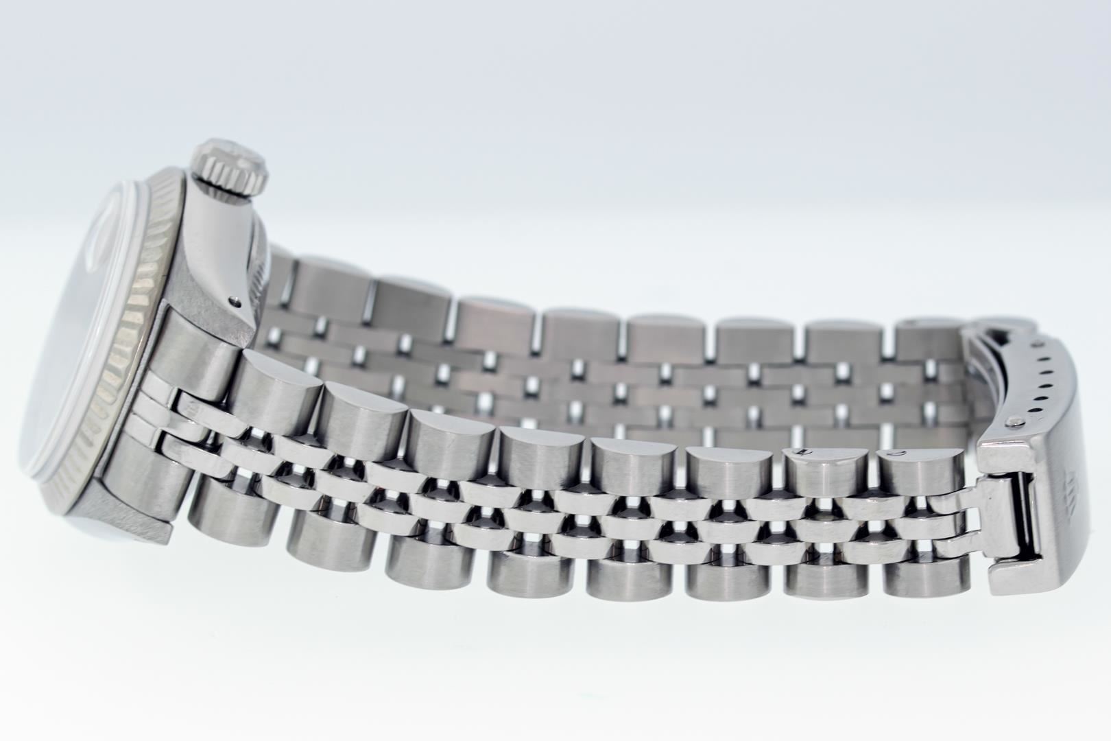 One Ladies Quickset Pre Owned Stainless Steel Rolex Datejust Polished Bright with Satin Finish, Serviced & Electronically Tested, Rolex Stainless Steel Case: 26mm, Rolex Stainless Steel Crown, Rolex Bezel: 18K White Gold Fluted Bezel, Custom Crystal: New With Magnifying Date Window. Rolex Hands: Luminescent Hands. Rolex Movement: Automatic Winding Movement. Rolex Dial: Silver Dial With Index Hour Markers And Lumi Dots. Date Window: 3 O'Clock Position Date Display, Model: Datejust. Condition: G-6 Extra Fine. Rolex Bracelet: Stainless Steel Jubilee Band. Bright Polish & Satin Finish. 6.0 Inch Length, Adjustable. Standard Clasp, With Rolex Logo. This Watch Has Been Serviced Time Tested And Is In Excellent Condition It Is Free Of All Scratches And Dents. This Watch Comes With A Rolex Box And Booklets.