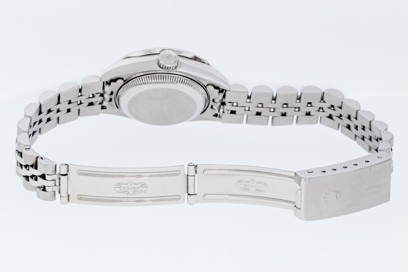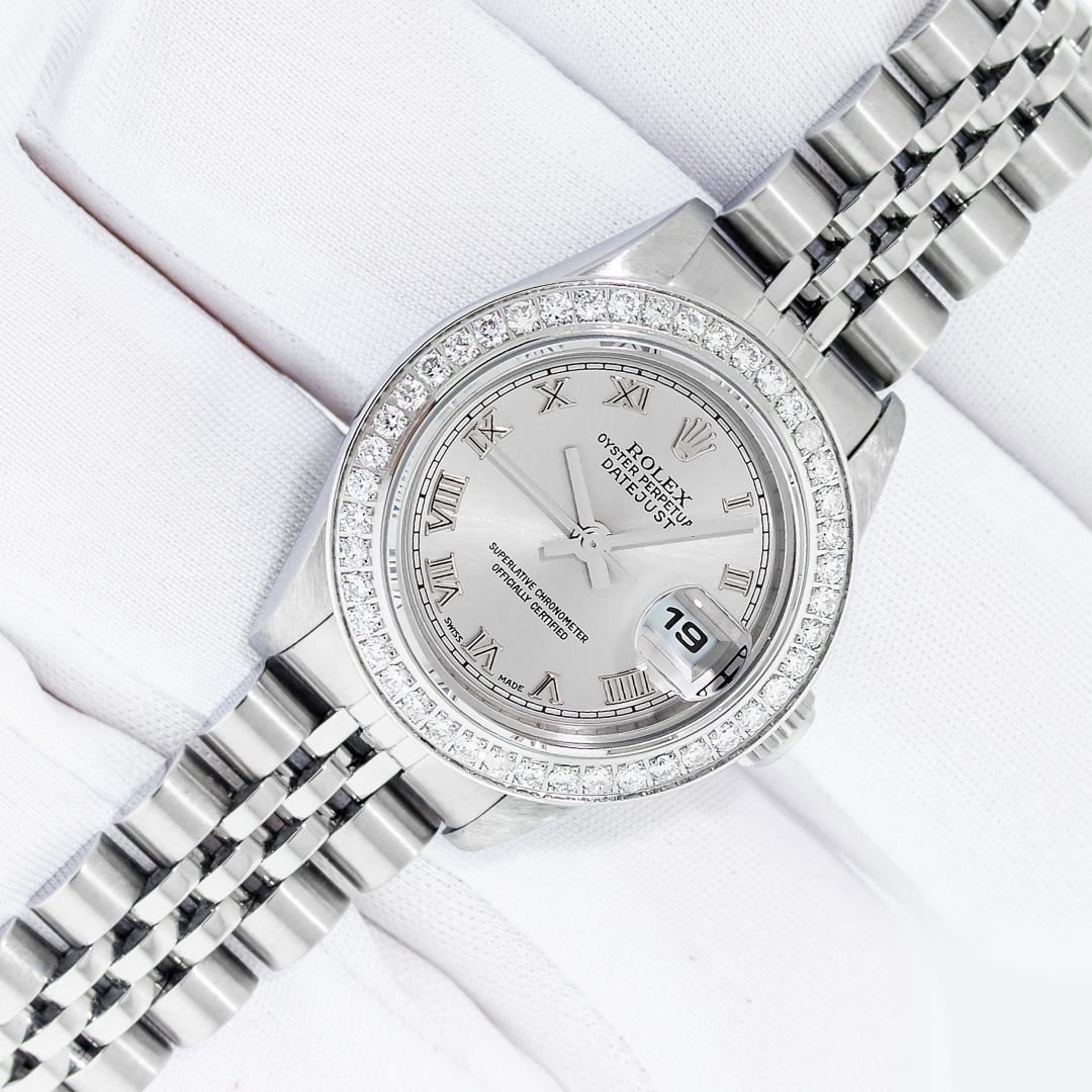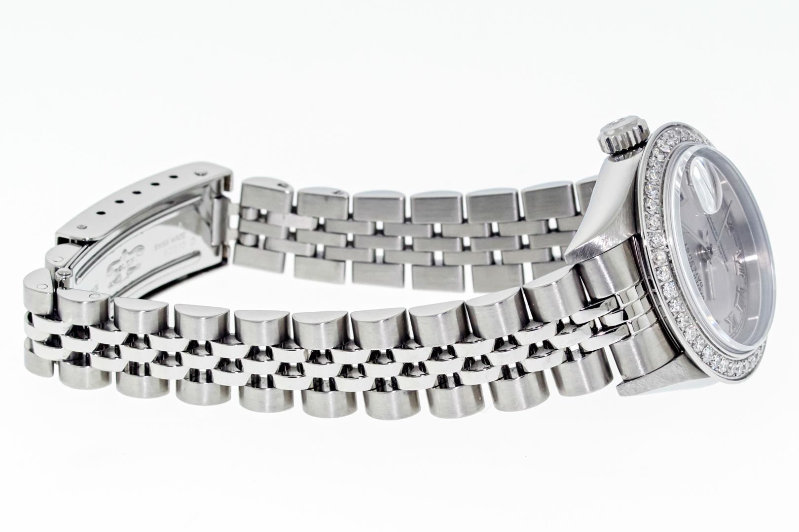 One Ladies Pre Owned Quickset Stainless Steel Rolex Datejust Polished Bright with Satin Finish, Serviced & Electronically Tested, Stainless Steel Case: 26mm. Rolex Stainless Steel Crown, Custom Bezel: New Stainless Steel Bead Set Diamond Bezel, Diamond Count: 40 Diamonds On Bezel. Custom Crystal: New Sapphire With Magnified Date Window. Custom Hands: New Hands. Rolex Movement: Automatic Winding Movement 2235. Rolex Dial: Gray With Roman Hour Markers & Square Track. Date Window: 3 O'Clock Position Date Display, Model: Quickset Datejust. Condition: G-6 Extra Fine. Rolex Bracelet: Stainless Steel Jubilee Band. Bright Polish & Satin Finish. 6.0 Inch Length, Adjustable. Standard Clasp, With Rolex Logo. This Watch Has Been Serviced Time Tested And Is In Excellent Condition It Is Free Of All Scratches And Dents.