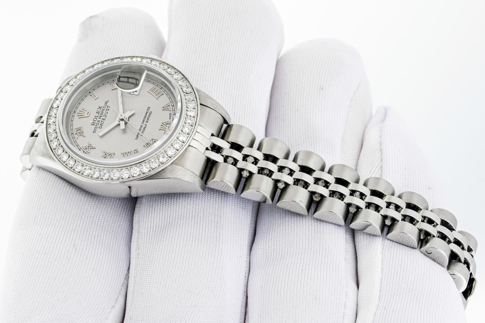One Ladies Pre Owned Quickset Stainless Steel Rolex Datejust Polished Bright with Satin Finish, Serviced & Electronically Tested, Stainless Steel Case: 26mm. Rolex Stainless Steel Crown, Custom Bezel: New Stainless Steel Bead Set Diamond Bezel, Diamond Count: 40 Diamonds On Bezel. Custom Crystal: New Sapphire With Magnified Date Window. Custom Hands: New Hands. Rolex Movement: Automatic Winding Movement 2235. Rolex Dial: Gray With Roman Hour Markers & Square Track. Date Window: 3 O'Clock Position Date Display, Model: Quickset Datejust. Condition: G-6 Extra Fine. Rolex Bracelet: Stainless Steel Jubilee Band. Bright Polish & Satin Finish. 6.0 Inch Length, Adjustable. Standard Clasp, With Rolex Logo. This Watch Has Been Serviced Time Tested And Is In Excellent Condition It Is Free Of All Scratches And Dents.
