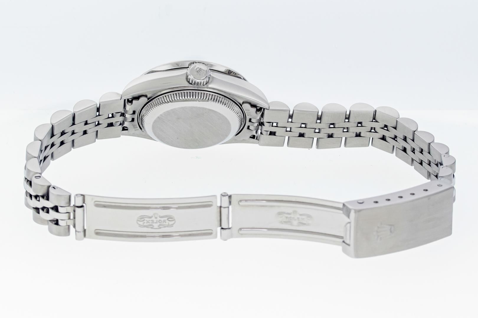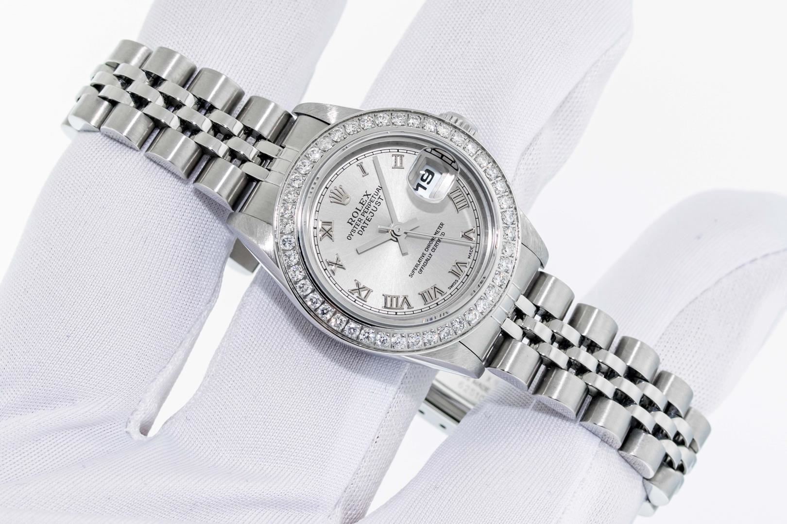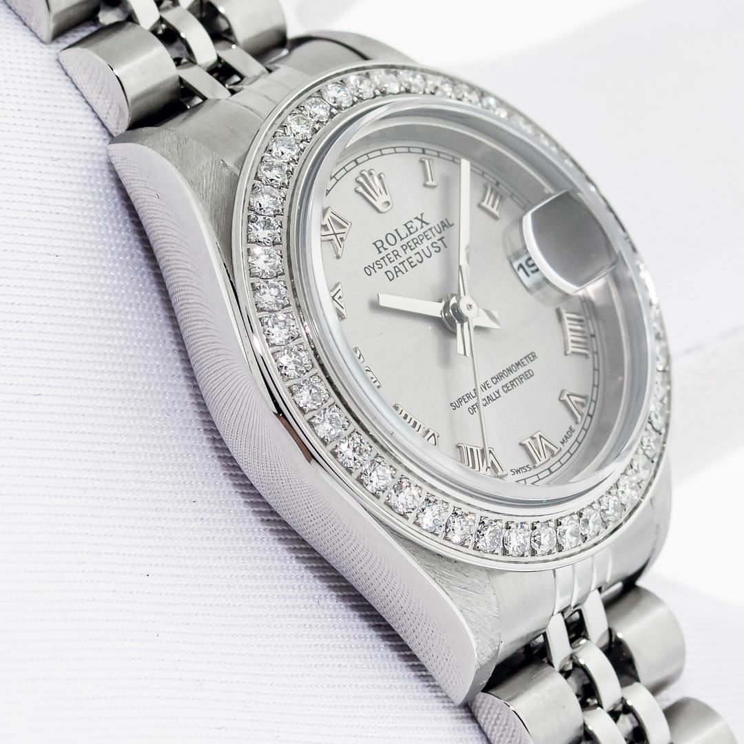 One Ladies Pre Owned Quickset Stainless Steel Rolex Datejust Polished Bright with Satin Finish, Serviced & Electronically Tested, Stainless Steel Case: 26mm. Rolex Stainless Steel Crown, Custom Bezel: New Stainless Steel Bead Set Diamond Bezel, Diamond Count: 40 Diamonds On Bezel. Custom Crystal: New Sapphire With Magnified Date Window. Custom Hands: New Hands. Rolex Movement: Automatic Winding Movement 2235. Rolex Dial: Gray With Roman Hour Markers & Square Track. Date Window: 3 O'Clock Position Date Display, Model: Quickset Datejust. Condition: G-6 Extra Fine. Rolex Bracelet: Stainless Steel Jubilee Band. Bright Polish & Satin Finish. 6.0 Inch Length, Adjustable. Standard Clasp, With Rolex Logo. This Watch Has Been Serviced Time Tested And Is In Excellent Condition It Is Free Of All Scratches And Dents.