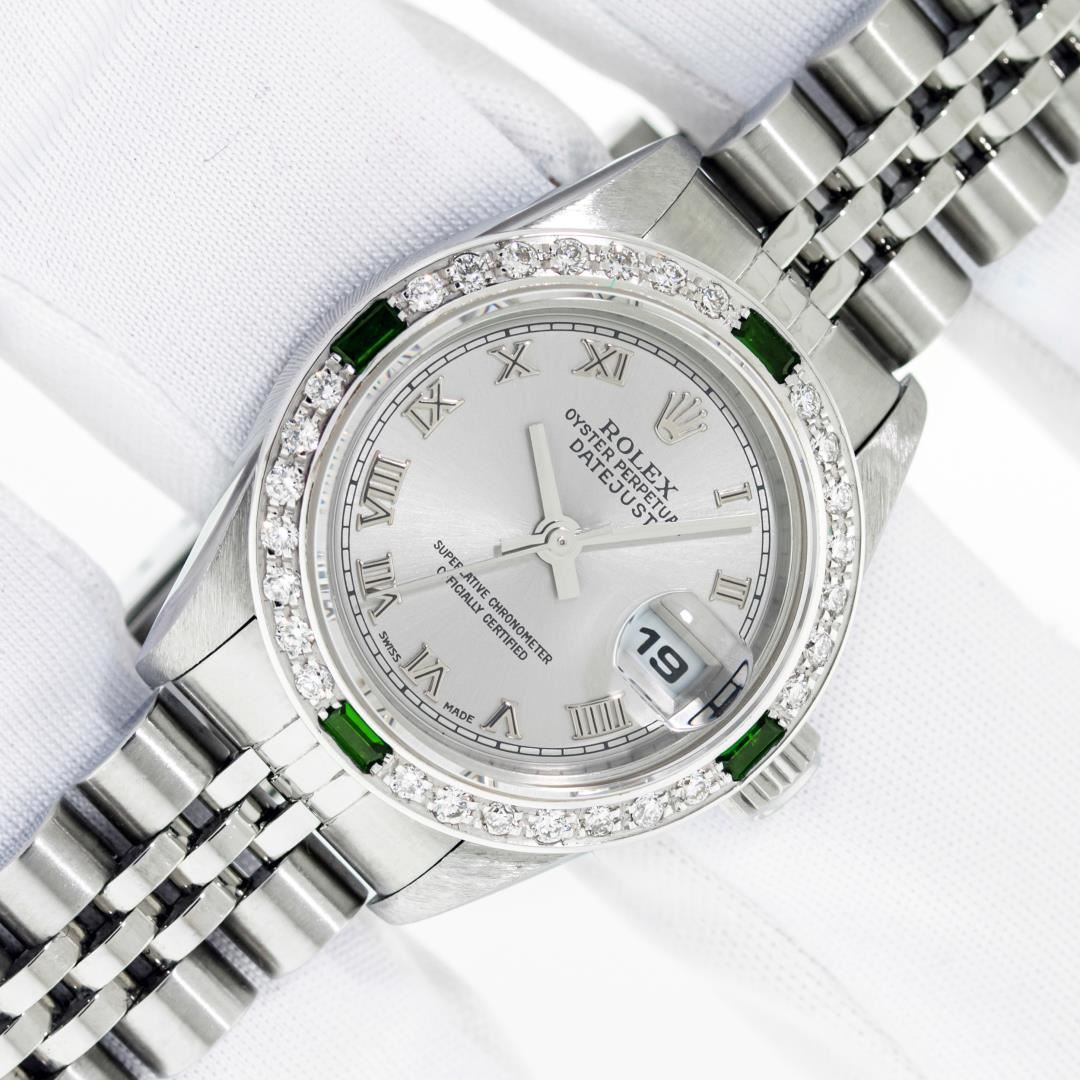 One Ladies Pre Owned Quickset Stainless Steel Rolex Datejust Polished Bright with Satin Finish, Serviced & Electronically Tested, Stainless Steel Case: 26mm. Rolex Stainless Steel Crown, Custom Bezel: New 18K White Gold Emerald Bead Set Diamond Bezel, Diamond + Gem Count: 28 Diamonds + 4 Emeralds. Custom Crystal: New Sapphire With Magnified Date Window. Custom Hands: New Hands. Rolex Movement: Automatic Winding Movement 2235. Rolex Dial: Gray With Roman Hour Markers & Square Track. Date Window: 3 O'Clock Position Date Display, Model: Quickset Datejust. Condition: G-6 Extra Fine. Rolex Bracelet: Stainless Steel Jubilee Band. Bright Polish & Satin Finish. 6.0 Inch Length, Adjustable. Standard Clasp, With Rolex Logo. This Watch Has Been Serviced Time Tested And Is In Excellent Condition It Is Free Of All Scratches And Dents.