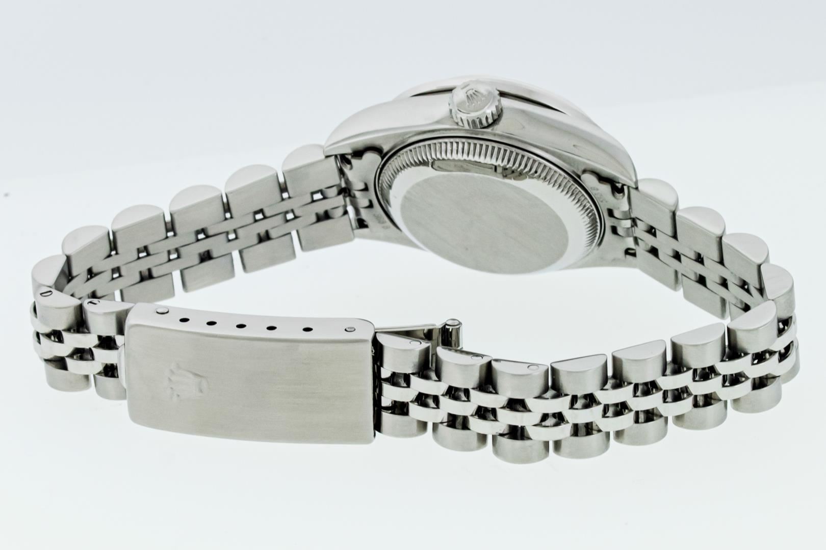 One Ladies Pre Owned Quickset Stainless Steel Rolex Datejust Polished Bright with Satin Finish, Serviced & Electronically Tested, Stainless Steel Case: 26mm. Rolex Stainless Steel Crown, Custom Bezel: New 18K White Gold Sapphire Bead Set Diamond Bezel, Diamond + Gem Count: 28 Diamonds + 4 Sapphires. Custom Crystal: New Sapphire With Magnified Date Window. Custom Hands: New Hands. Rolex Movement: Automatic Winding Movement 2235. Rolex Dial: Gray With Roman Hour Markers & Square Track. Date Window: 3 O'Clock Position Date Display, Model: Quickset Datejust. Condition: G-6 Extra Fine. Rolex Bracelet: Stainless Steel Jubilee Band. Bright Polish & Satin Finish. 6.0 Inch Length, Adjustable. Standard Clasp, With Rolex Logo. This Watch Has Been Serviced Time Tested And Is In Excellent Condition It Is Free Of All Scratches And Dents.