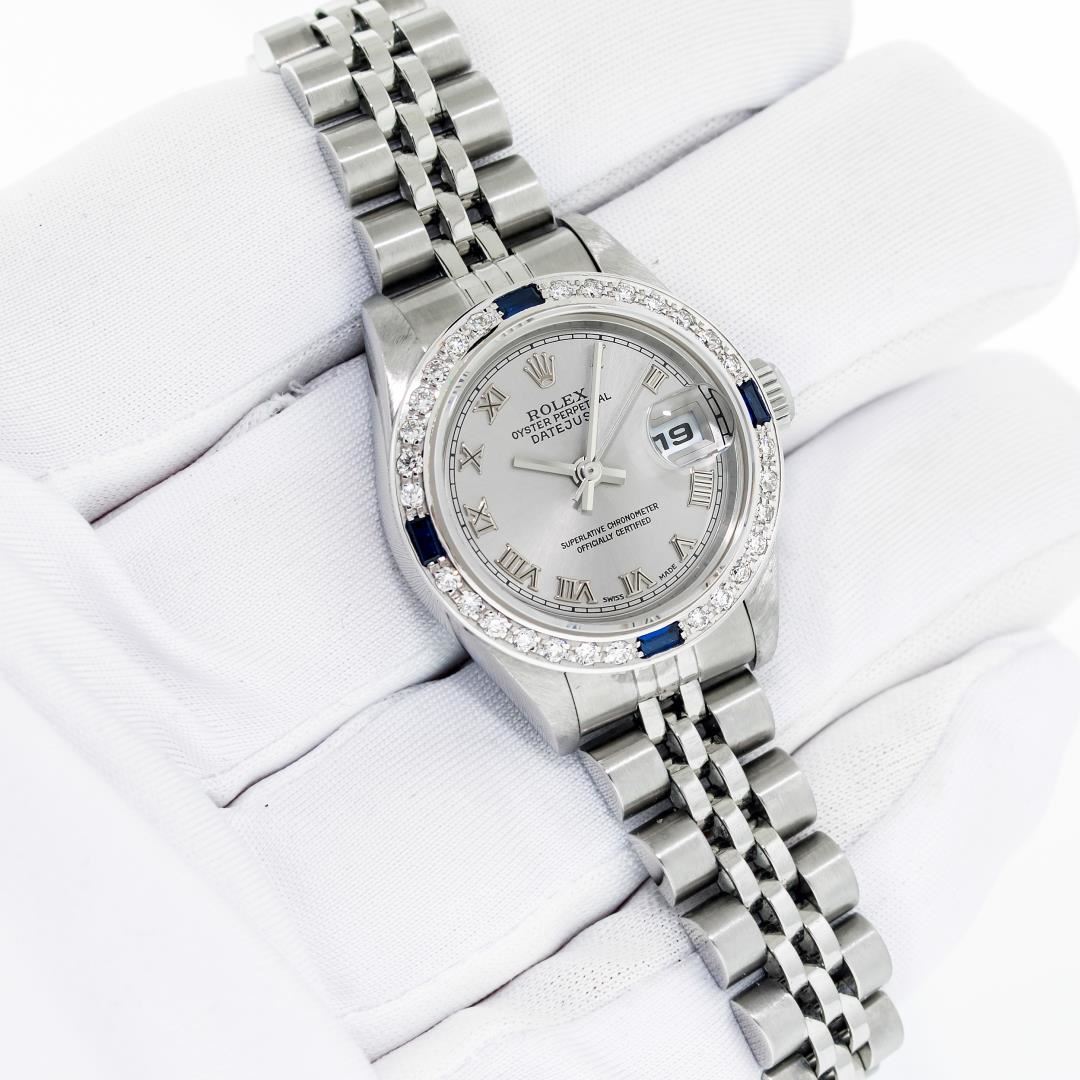 One Ladies Pre Owned Quickset Stainless Steel Rolex Datejust Polished Bright with Satin Finish, Serviced & Electronically Tested, Stainless Steel Case: 26mm. Rolex Stainless Steel Crown, Custom Bezel: New 18K White Gold Sapphire Bead Set Diamond Bezel, Diamond + Gem Count: 28 Diamonds + 4 Sapphires. Custom Crystal: New Sapphire With Magnified Date Window. Custom Hands: New Hands. Rolex Movement: Automatic Winding Movement 2235. Rolex Dial: Gray With Roman Hour Markers & Square Track. Date Window: 3 O'Clock Position Date Display, Model: Quickset Datejust. Condition: G-6 Extra Fine. Rolex Bracelet: Stainless Steel Jubilee Band. Bright Polish & Satin Finish. 6.0 Inch Length, Adjustable. Standard Clasp, With Rolex Logo. This Watch Has Been Serviced Time Tested And Is In Excellent Condition It Is Free Of All Scratches And Dents.