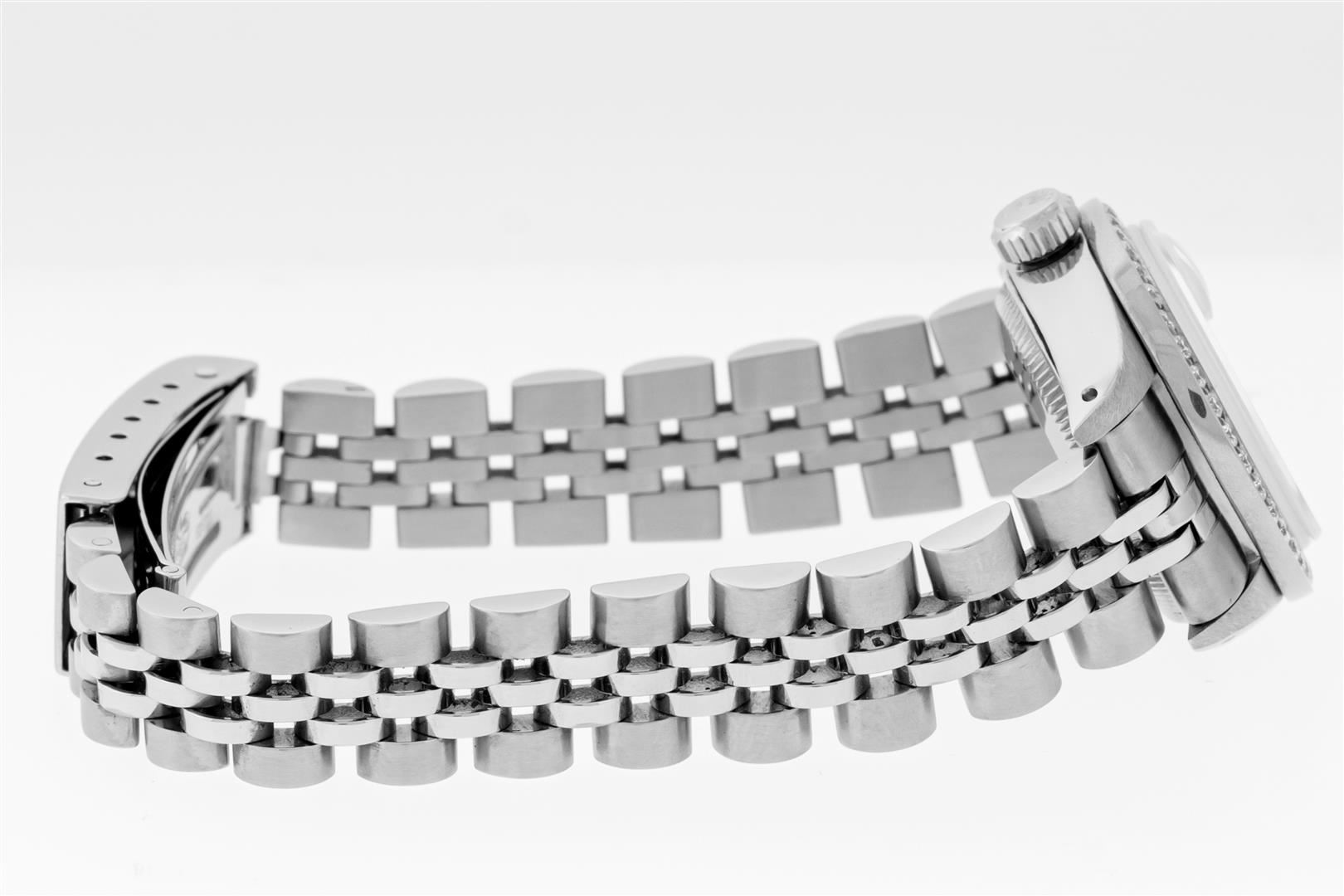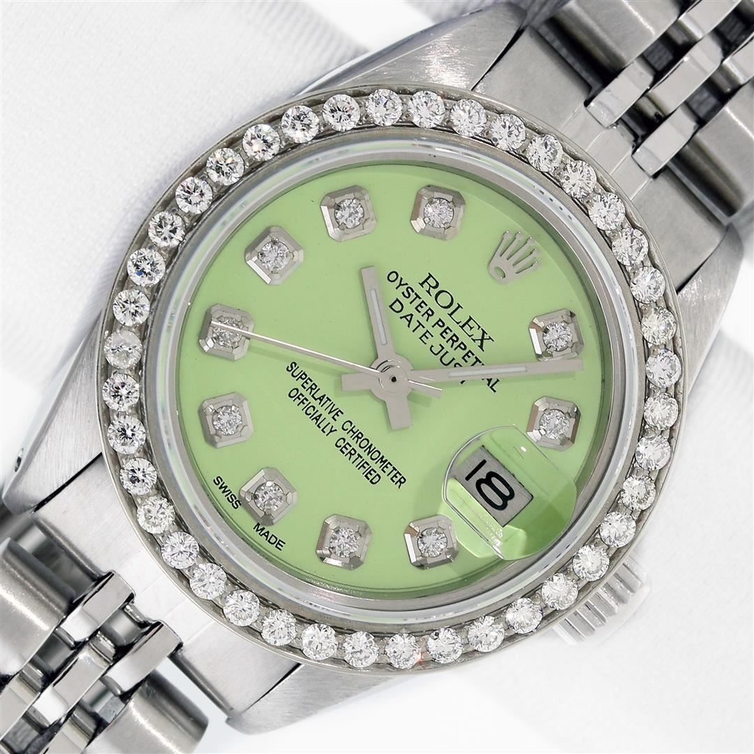 One Ladies Stainless Steel Rolex Datejust Polished Bright with Satin Finish, Serviced & Electronically Tested, Rolex Stainless Steel Case: 26mm, Rolex Stainless Steel Crown, Custom Bezel: New Stainless Steel Beadset Diamond Bezel, Diamond Count: 44 Diamonds Total, Clarity: SI-VS, Color: G to H. Custom Crystal: New Sapphire With Magnified Date Window. Custom Hands: New Luminescent Hands. Rolex Movement: Automatic Winding Movement. Custom Dial: Refinished To Green With Custom Added Diamond Hour Markers, Diamond Count: 10 Diamonds in Dial G To H In Color, Clarity: SI-VS. Date Window: 3 O'clock Position Date Display, Model: Datejust. Condition: G-6 Extra Fine. Rolex Bracelet: Stainless Steel Jubilee Band. Bright Polish & Satin Finish. 6.0 Inch Length, Adjustable. Standard Clasp, With Rolex Logo. This Pre Owned Watch Has Been Serviced Time Tested And Is In Excellent Condition It Is Free Of All Scratches And Dents.