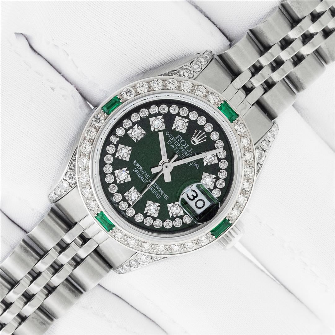 One Ladies Stainless Steel Rolex Datejust Polished Bright with Satin Finish, Serviced & Electronically Tested, Rolex Stainless Steel Case: 26mm, Rolex Stainless Steel Crown, Custom Diamond Lugs: 24 Diamonds On Lugs, Clarity: SI-VS, Color: G to H. Custom Bezel: New 18K White Gold Diamond + Emerald Beadset Diamond Bezel, Stone Count: 28 Diamonds + 4 Emeralds, Total Weight .70 Carat, Clarity: SI-VS, Color: G to H. Custom Crystal: New Sapphire With Magnified Date Window. Custom Hands: New Luminescent Hands. Rolex Movement: Automatic Winding Movement. Custom Dial: Refinished To Green With Custom Added Diamonds, 43 Diamonds in Dial G To H In Color, Clarity: VS. Date Window: 3 O'clock Position Date Display, Model: Datejust. Condition: G-6 Extra Fine. Rolex Bracelet: Stainless Steel Jubilee Band. Bright Polish & Satin Finish. 6.0 Inch Length, Adjustable. Standard Clasp, With Rolex Logo. This Pre Owned Watch Has Been Serviced Time Tested And Is In Excellent Condition It Is Free Of All Scratches And Dents. This Watch Comes With A Rolex Box.