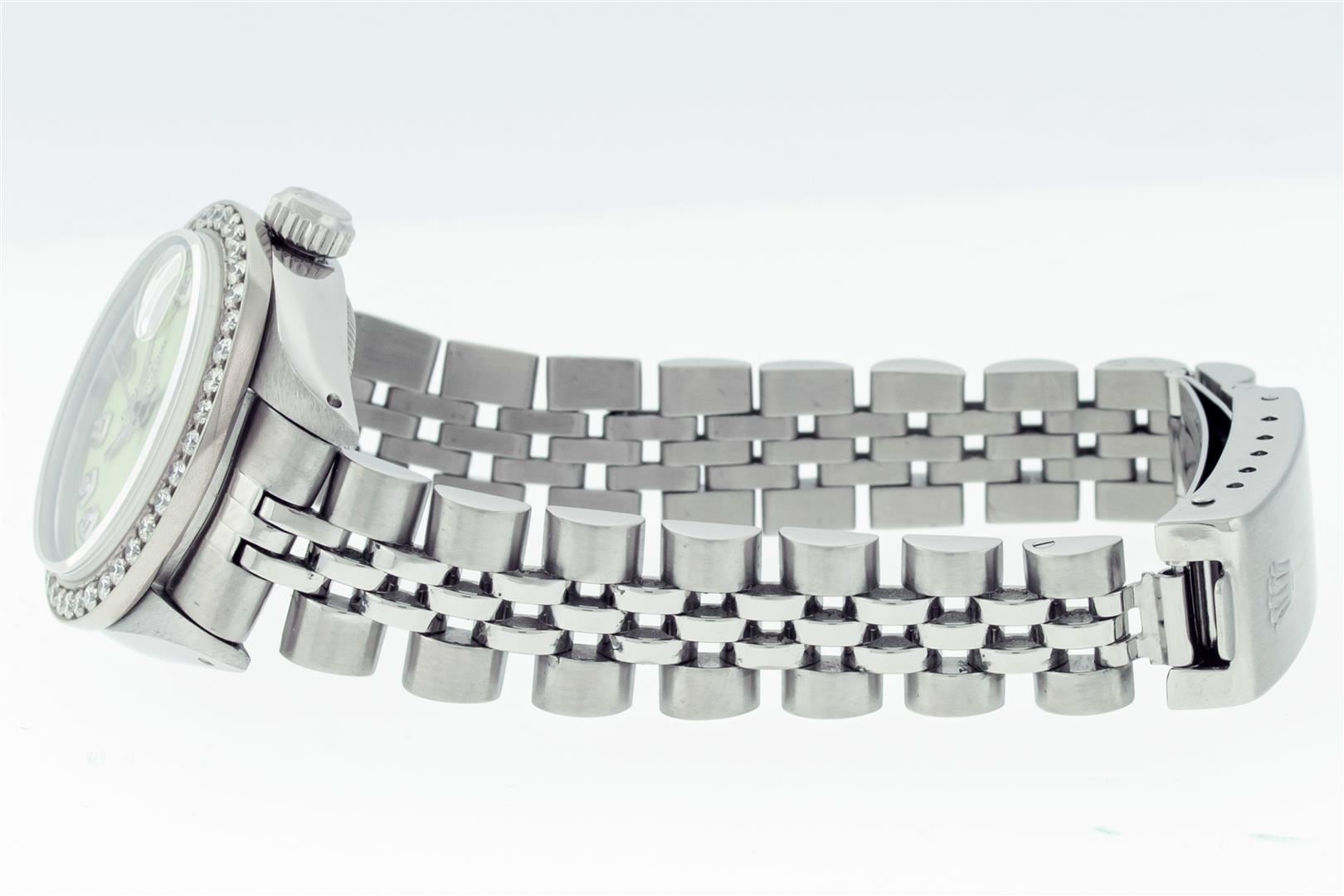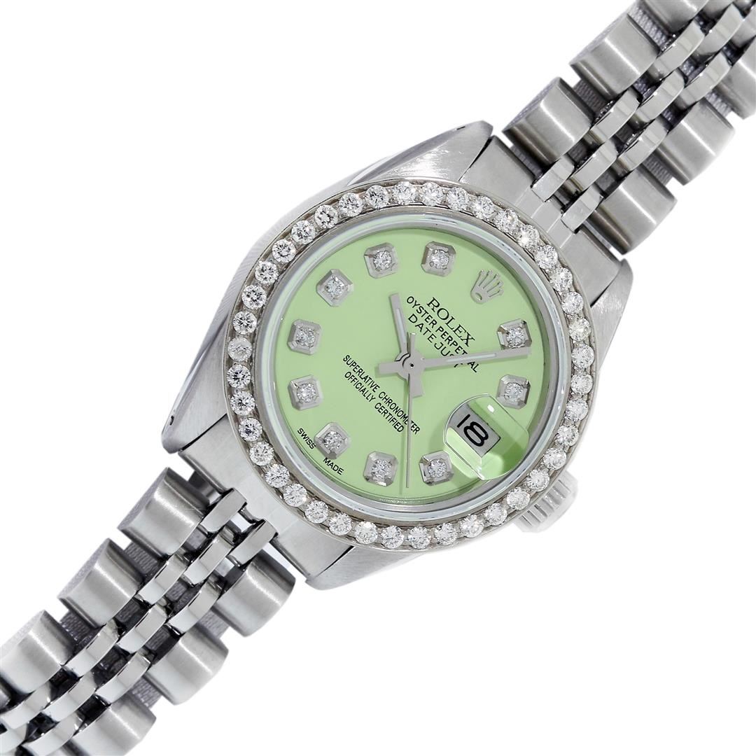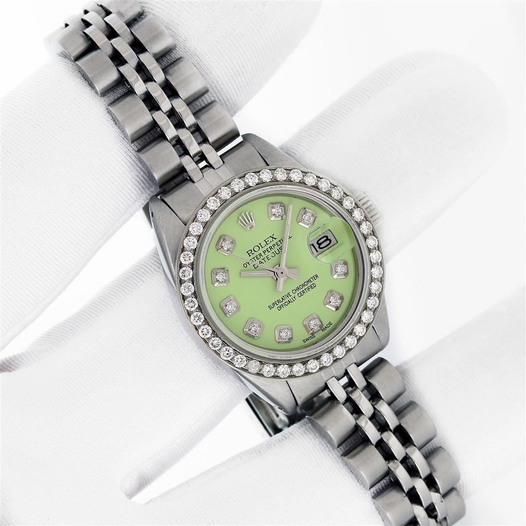 One Ladies Stainless Steel Rolex Datejust Polished Bright with Satin Finish, Serviced & Electronically Tested, Rolex Stainless Steel Case: 26mm, Rolex Stainless Steel Crown, Custom Bezel: New Stainless Steel Beadset Diamond Bezel, Diamond Count: 44 Diamonds Total, Clarity: SI-VS, Color: G to H. Custom Crystal: New Sapphire With Magnified Date Window. Custom Hands: New Luminescent Hands. Rolex Movement: Automatic Winding Movement. Custom Dial: Refinished To Green With Custom Added Diamond Hour Markers, Diamond Count: 10 Diamonds in Dial G To H In Color, Clarity: SI-VS. Date Window: 3 O'clock Position Date Display, Model: Datejust. Condition: G-6 Extra Fine. Rolex Bracelet: Stainless Steel Jubilee Band. Bright Polish & Satin Finish. 6.0 Inch Length, Adjustable. Standard Clasp, With Rolex Logo. This Pre Owned Watch Has Been Serviced Time Tested And Is In Excellent Condition It Is Free Of All Scratches And Dents.