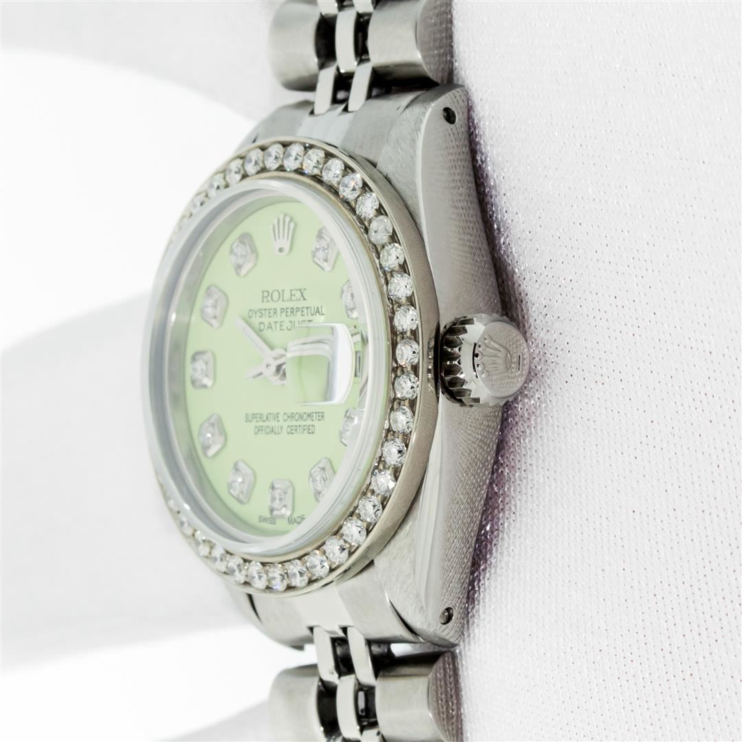 One Ladies Stainless Steel Rolex Datejust Polished Bright with Satin Finish, Serviced & Electronically Tested, Rolex Stainless Steel Case: 26mm, Rolex Stainless Steel Crown, Custom Bezel: New Stainless Steel Beadset Diamond Bezel, Diamond Count: 44 Diamonds Total, Clarity: SI-VS, Color: G to H. Custom Crystal: New Sapphire With Magnified Date Window. Custom Hands: New Luminescent Hands. Rolex Movement: Automatic Winding Movement. Custom Dial: Refinished To Green With Custom Added Diamond Hour Markers, Diamond Count: 10 Diamonds in Dial G To H In Color, Clarity: SI-VS. Date Window: 3 O'clock Position Date Display, Model: Datejust. Condition: G-6 Extra Fine. Rolex Bracelet: Stainless Steel Jubilee Band. Bright Polish & Satin Finish. 6.0 Inch Length, Adjustable. Standard Clasp, With Rolex Logo. This Pre Owned Watch Has Been Serviced Time Tested And Is In Excellent Condition It Is Free Of All Scratches And Dents.