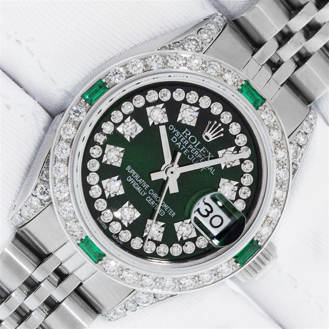 One Ladies Stainless Steel Rolex Datejust Polished Bright with Satin Finish, Serviced & Electronically Tested, Rolex Stainless Steel Case: 26mm, Rolex Stainless Steel Crown, Custom Diamond Lugs: 24 Diamonds On Lugs, Clarity: SI-VS, Color: G to H. Custom Bezel: New 18K White Gold Diamond + Emerald Beadset Diamond Bezel, Stone Count: 28 Diamonds + 4 Emeralds, Total Weight .70 Carat, Clarity: SI-VS, Color: G to H. Custom Crystal: New Sapphire With Magnified Date Window. Custom Hands: New Luminescent Hands. Rolex Movement: Automatic Winding Movement. Custom Dial: Refinished To Green With Custom Added Diamonds, 43 Diamonds in Dial G To H In Color, Clarity: VS. Date Window: 3 O'clock Position Date Display, Model: Datejust. Condition: G-6 Extra Fine. Rolex Bracelet: Stainless Steel Jubilee Band. Bright Polish & Satin Finish. 6.0 Inch Length, Adjustable. Standard Clasp, With Rolex Logo. This Pre Owned Watch Has Been Serviced Time Tested And Is In Excellent Condition It Is Free Of All Scratches And Dents. This Watch Comes With A Rolex Box.