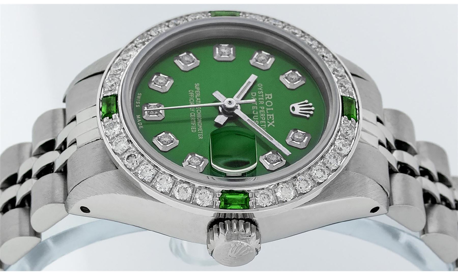 One Ladies Stainless Steel Rolex Datejust Polished Bright with Satin Finish, Serviced & Electronically Tested, Stainless Steel Case: 26mm, Stainless Steel Crown, Custom Bezel: New 18K White Gold Emerald Beadset Diamond Bezel, Diamond + Gem Count: 28 Diamonds + 4 Emeralds. Total Weight .70 Carat, Clarity: SI-VS, Color: G to H. Custom Crystal: New Synthetic Sapphire Cyclops Lens. Custom Hands: New Luminescent Hands. Movement: Automatic Winding Movement Caliber 2030. Custom Dial: Refinished Green With Diamond Hour Markers, 10 Diamond in Dial G To H In Color, Clarity: SI-VS. Date Window: 3 O'Clock Position Date Display, Model: Datejust. Condition: G-6 Extra Fine. Bracelet: Stainless Steel Jubilee. Bright Polish & Satin Finish. 6.0 Inch Length, Adjustable. Standard Clasp, With Rolex Logo. This Watch Has Been Serviced Time Tested And Is In Excellent Condition It Is Free Of All Scratches And Dents.