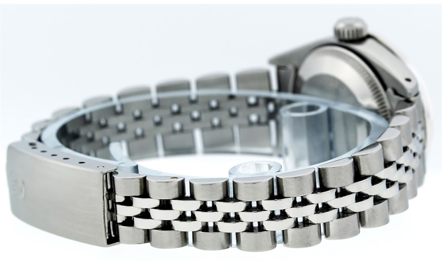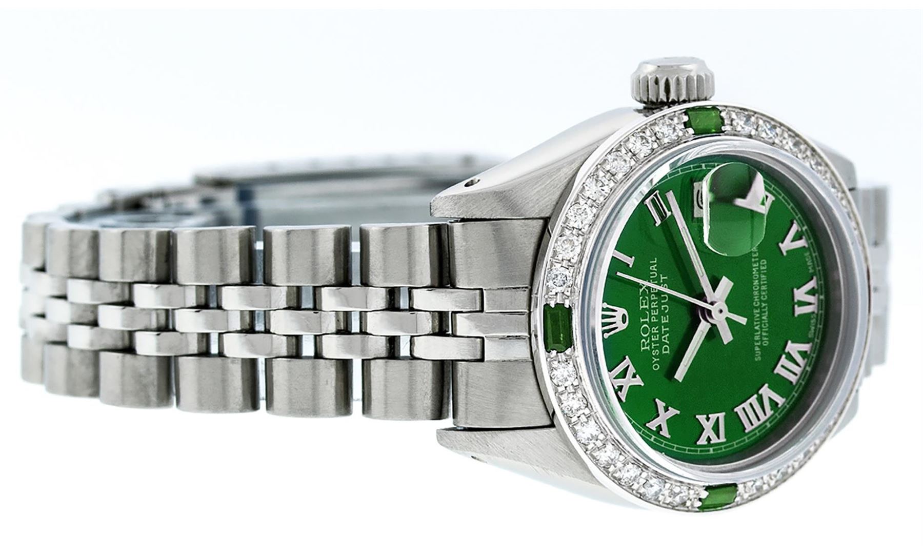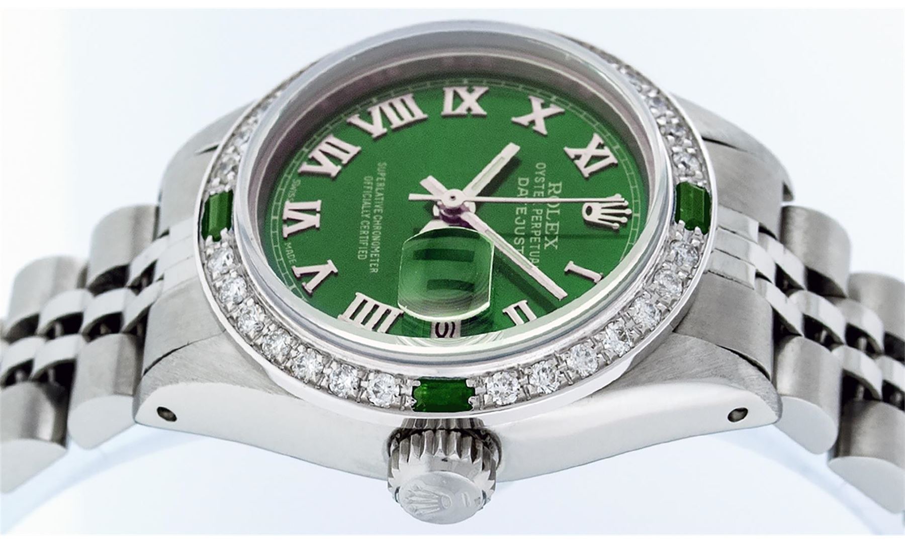One Ladies Stainless Steel Rolex Datejust Polished Bright with Satin Finish, Serviced & Electronically Tested, Stainless Steel Case: 26mm, Stainless Steel Crown, Custom Bezel: New 18K White Gold Emerald Beadset Diamond Bezel, Diamond + Gem Count: 28 Diamonds + 4 Emeralds, Total Weight .70 Carat, Clarity: SI-VS, Color: G to H. Custom Crystal: New Scratch Resistant Synthetic Sapphire Cyclops Lens. Custom Hands: New Luminescent Hands. Movement: Automatic Winding Movement Caliber 2030. Custom Dial: Green Roman Dial With Square Track. Date Window: 3 O'Clock Position Date Display, Model: Datejust. Condition: G-6 Extra Fine. Bracelet: Stainless Steel Jubilee. Bright Polish & Satin Finish. 6.0 Inch Length, Adjustable. Standard Clasp, With Rolex Logo. This Watch Has Been Serviced Time Tested And Is In Excellent Condition It Is Free Of All Scratches And Dents.