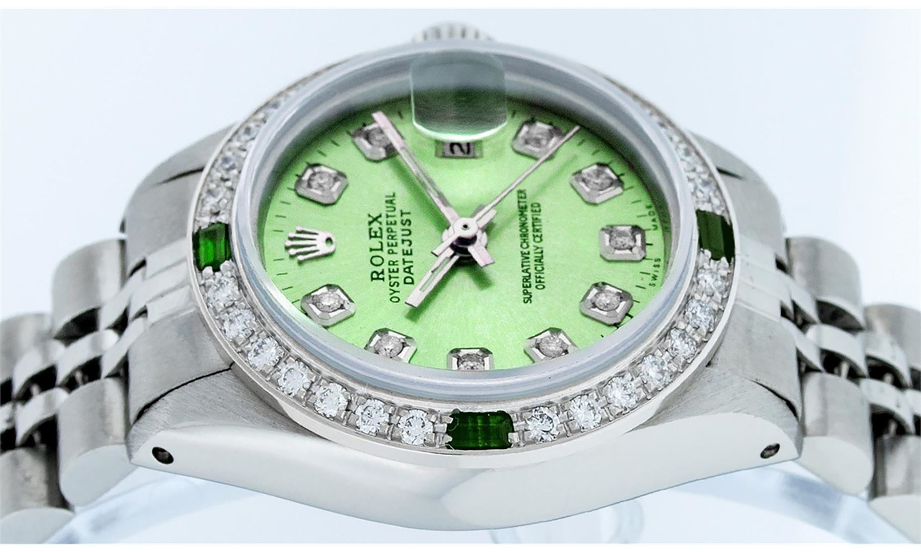 One Ladies Stainless Steel Rolex Datejust Polished Bright with Satin Finish, Serviced & Electronically Tested, Stainless Steel Case: 26mm, Stainless Steel Crown, Custom Bezel: New 18K White Gold Emerald Beadset Diamond Bezel, Diamond + Gem Count: 28 Diamonds + 4 Emeralds. Total Weight .70 Carat, Clarity: SI-VS, Color: G to H. Custom Crystal: New Scratch Resistant Synthetic Sapphire Cyclops Lens. Custom Hands: New Luminescent Hands. Movement: Automatic Winding Movement Caliber 2030. Custom Dial: Refinished Green With Diamond Hour Markers And Dash Tracks, 10 Diamonds in Dial, G To H In Color, Clarity: SI-VS. Date Window: 3 O'Clock Position Date Display, Model: Datejust. Condition: G-6 Extra Fine. Bracelet: Stainless Steel Jubilee. Bright Polish & Satin Finish. 6.0 Inch Length, Adjustable. Standard Clasp, With Rolex Logo. This Watch Has Been Serviced Time Tested And Is In Excellent Condition It Is Free Of All Scratches And Dents.