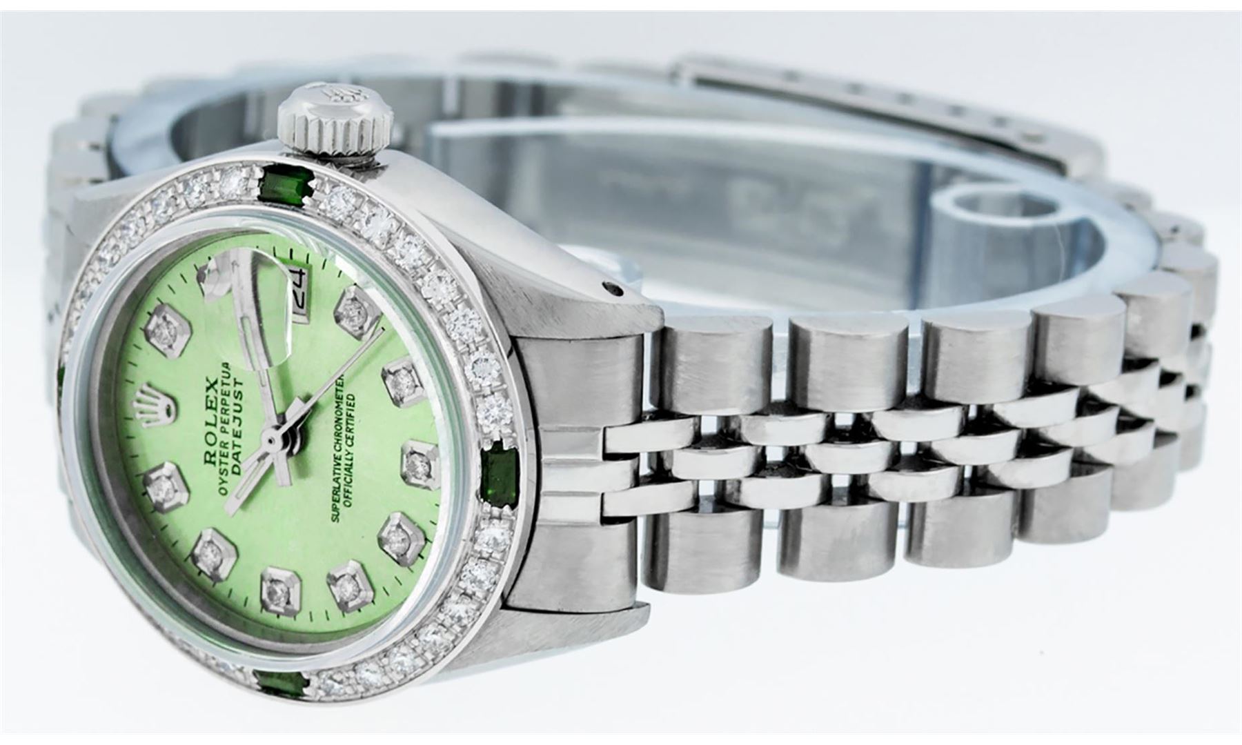 One Ladies Stainless Steel Rolex Datejust Polished Bright with Satin Finish, Serviced & Electronically Tested, Stainless Steel Case: 26mm, Stainless Steel Crown, Custom Bezel: New 18K White Gold Emerald Beadset Diamond Bezel, Diamond + Gem Count: 28 Diamonds + 4 Emeralds. Total Weight .70 Carat, Clarity: SI-VS, Color: G to H. Custom Crystal: New Scratch Resistant Synthetic Sapphire Cyclops Lens. Custom Hands: New Luminescent Hands. Movement: Automatic Winding Movement Caliber 2030. Custom Dial: Refinished Green With Diamond Hour Markers And Dash Tracks, 10 Diamonds in Dial, G To H In Color, Clarity: SI-VS. Date Window: 3 O'Clock Position Date Display, Model: Datejust. Condition: G-6 Extra Fine. Bracelet: Stainless Steel Jubilee. Bright Polish & Satin Finish. 6.0 Inch Length, Adjustable. Standard Clasp, With Rolex Logo. This Watch Has Been Serviced Time Tested And Is In Excellent Condition It Is Free Of All Scratches And Dents.