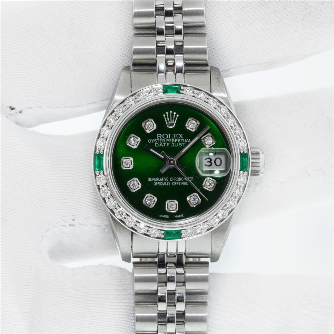 One Ladies Stainless Steel Rolex Datejust Polished Bright with Satin Finish, Serviced & Electronically Tested, Rolex Stainless Steel Case: 26mm, Rolex Stainless Steel Crown, Custom Bezel: New 18K White Gold Emerald Beadset Diamond Bezel, Diamond + Gem Count: 28 Diamonds + 4 Emeralds. Total Weight .70 Carat, Clarity: SI-VS, Color: G to H. Custom Crystal: New Sapphire With Magnified Date Window. Custom Hands: New Luminescent Hands. Rolex Movement: Automatic Winding Movement. Custom Dial: Refinished To Green With Custom Added Diamonds, 10 Diamond in Dial G To H In Color, Clarity: SI-VS. Date Window: 3 O'clock Position Date Display, Model: Datejust. Condition: G-6 Extra Fine. Rolex Bracelet: Stainless Steel Jubilee Band. Bright Polish & Satin Finish. 6.0 Inch Length, Adjustable. Standard Clasp, With Rolex Logo. This Pre Owned Watch Has Been Serviced Time Tested And Is In Excellent Condition It Is Free Of All Scratches And Dents. This Watch Comes With A Rolex Box.