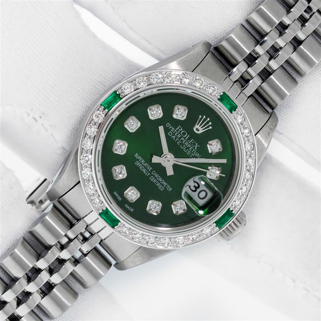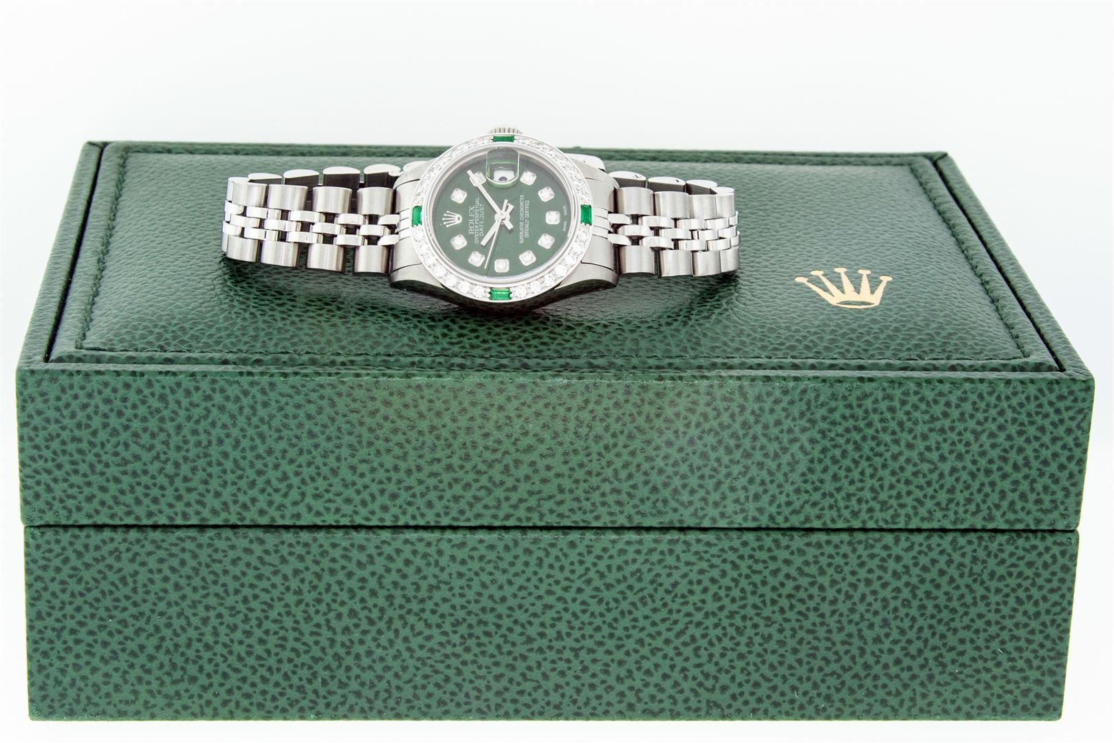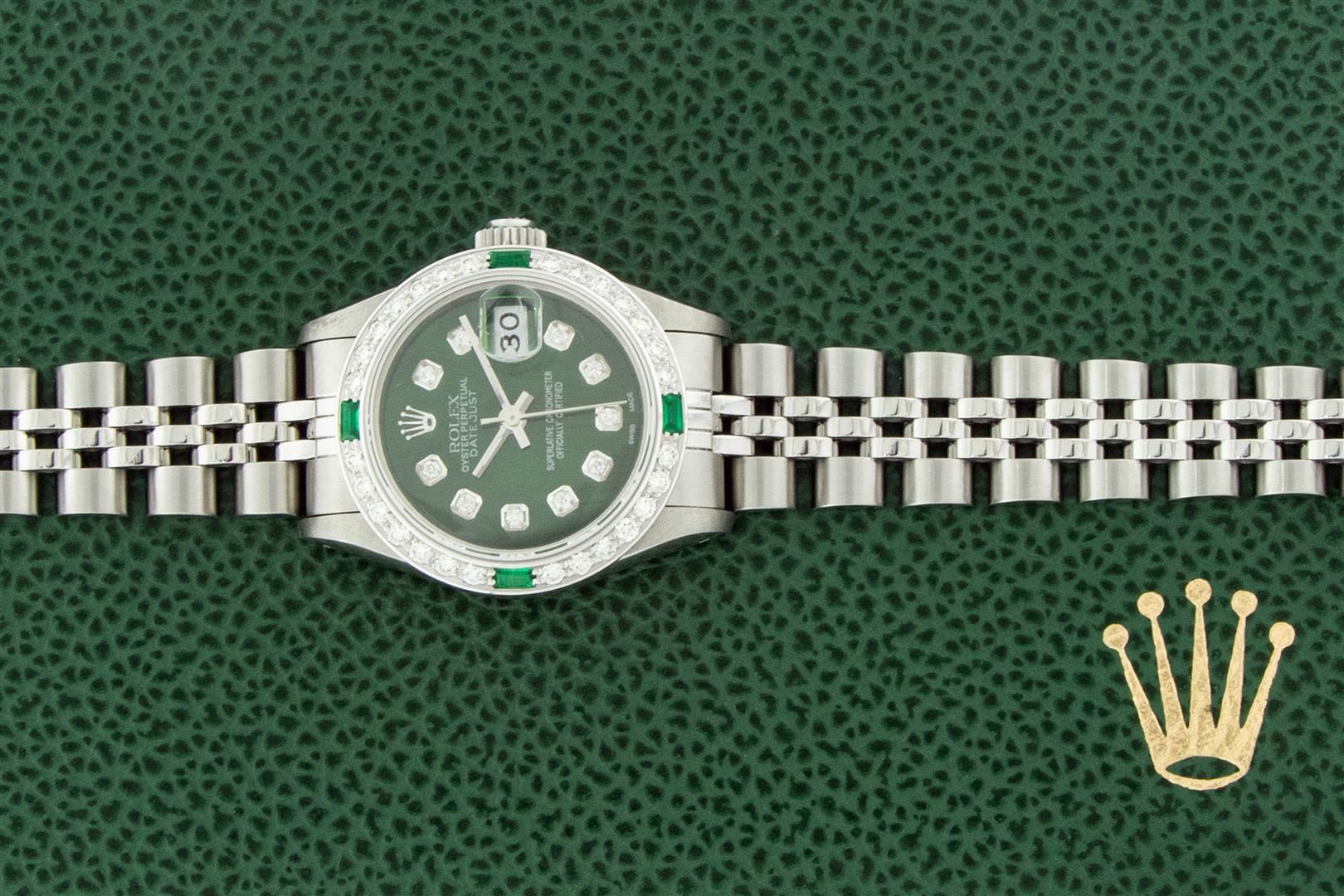 One Ladies Stainless Steel Rolex Datejust Polished Bright with Satin Finish, Serviced & Electronically Tested, Rolex Stainless Steel Case: 26mm, Rolex Stainless Steel Crown, Custom Bezel: New 18K White Gold Emerald Beadset Diamond Bezel, Diamond + Gem Count: 28 Diamonds + 4 Emeralds. Total Weight .70 Carat, Clarity: SI-VS, Color: G to H. Custom Crystal: New Sapphire With Magnified Date Window. Custom Hands: New Luminescent Hands. Rolex Movement: Automatic Winding Movement. Custom Dial: Refinished To Green With Custom Added Diamonds, 10 Diamond in Dial G To H In Color, Clarity: SI-VS. Date Window: 3 O'clock Position Date Display, Model: Datejust. Condition: G-6 Extra Fine. Rolex Bracelet: Stainless Steel Jubilee Band. Bright Polish & Satin Finish. 6.0 Inch Length, Adjustable. Standard Clasp, With Rolex Logo. This Pre Owned Watch Has Been Serviced Time Tested And Is In Excellent Condition It Is Free Of All Scratches And Dents. This Watch Comes With A Rolex Box.