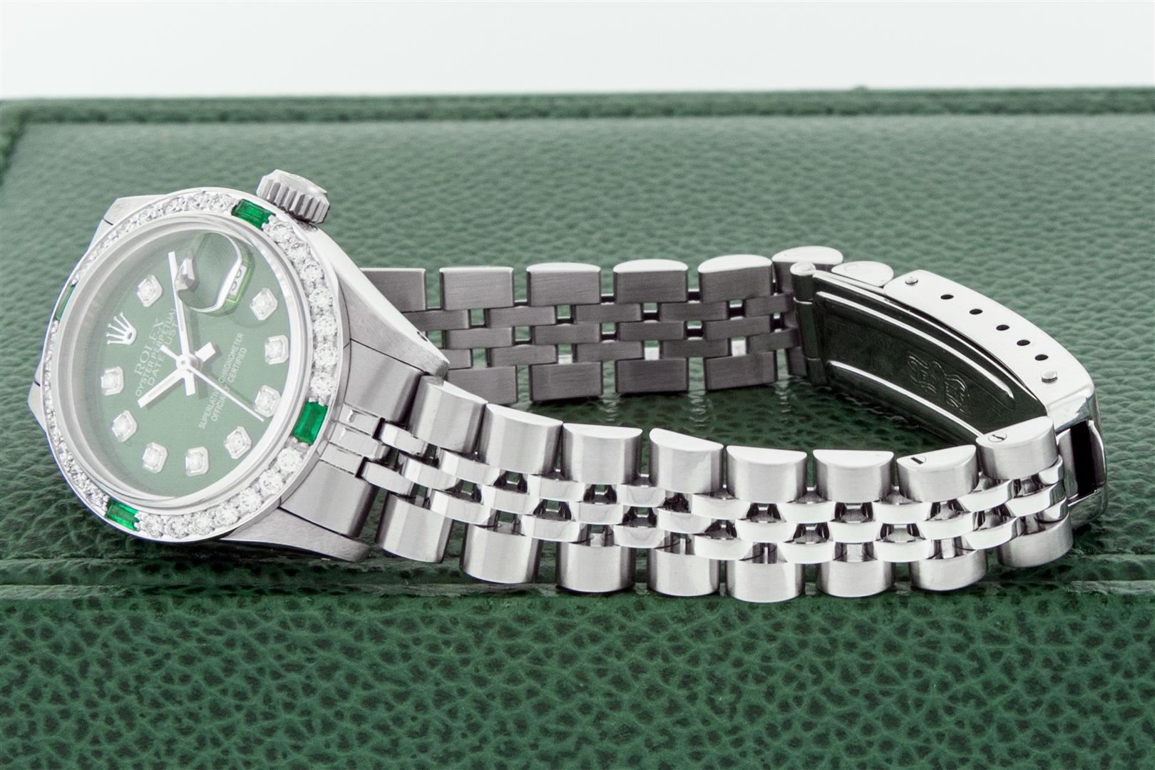 One Ladies Stainless Steel Rolex Datejust Polished Bright with Satin Finish, Serviced & Electronically Tested, Rolex Stainless Steel Case: 26mm, Rolex Stainless Steel Crown, Custom Bezel: New 18K White Gold Emerald Beadset Diamond Bezel, Diamond + Gem Count: 28 Diamonds + 4 Emeralds. Total Weight .70 Carat, Clarity: SI-VS, Color: G to H. Custom Crystal: New Sapphire With Magnified Date Window. Custom Hands: New Luminescent Hands. Rolex Movement: Automatic Winding Movement. Custom Dial: Refinished To Green With Custom Added Diamonds, 10 Diamond in Dial G To H In Color, Clarity: SI-VS. Date Window: 3 O'clock Position Date Display, Model: Datejust. Condition: G-6 Extra Fine. Rolex Bracelet: Stainless Steel Jubilee Band. Bright Polish & Satin Finish. 6.0 Inch Length, Adjustable. Standard Clasp, With Rolex Logo. This Pre Owned Watch Has Been Serviced Time Tested And Is In Excellent Condition It Is Free Of All Scratches And Dents. This Watch Comes With A Rolex Box.