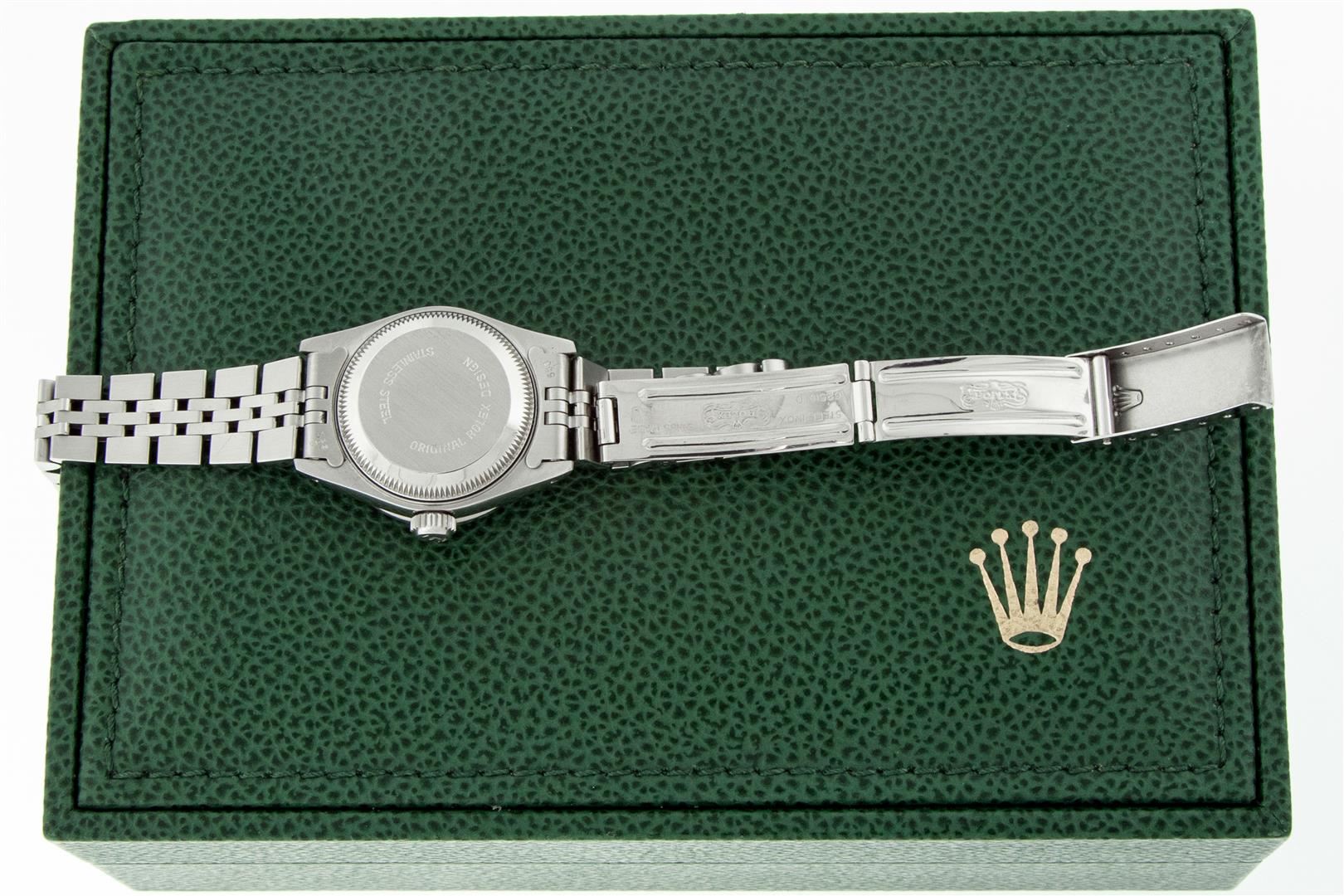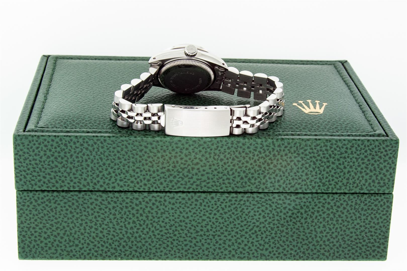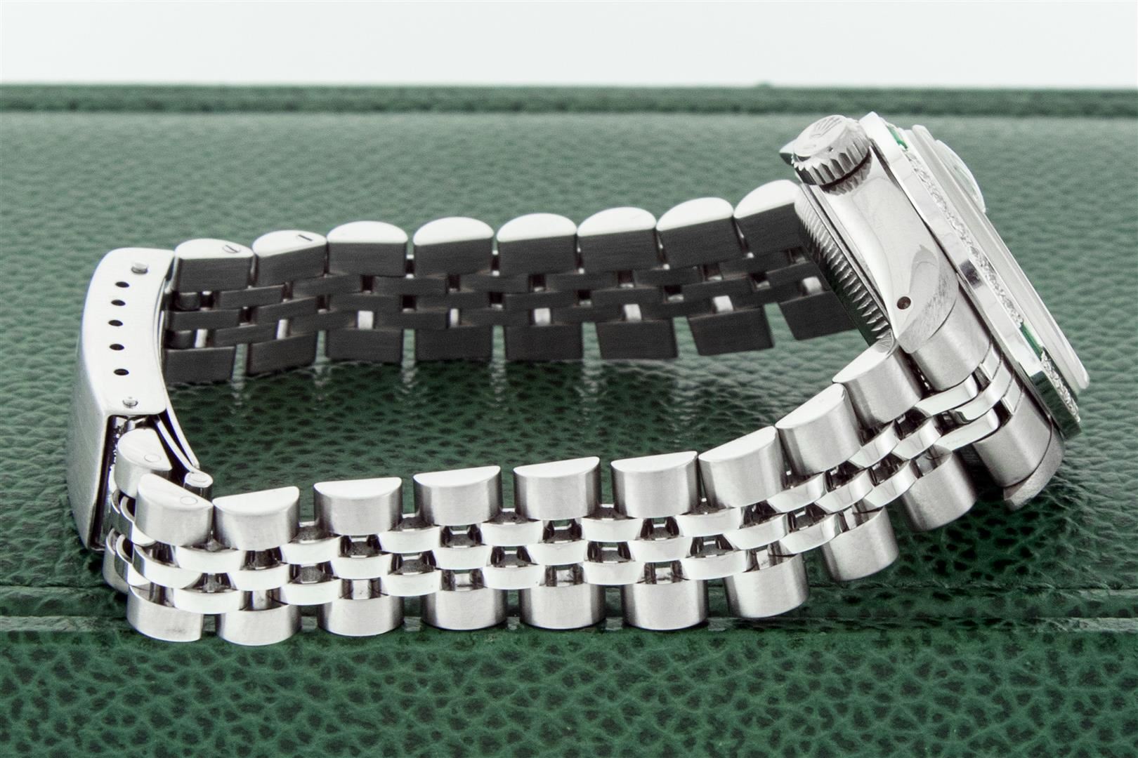 One Ladies Stainless Steel Rolex Datejust Polished Bright with Satin Finish, Serviced & Electronically Tested, Rolex Stainless Steel Case: 26mm, Rolex Stainless Steel Crown, Custom Bezel: New 18K White Gold Emerald Beadset Diamond Bezel, Diamond + Gem Count: 28 Diamonds + 4 Emeralds. Total Weight .70 Carat, Clarity: SI-VS, Color: G to H. Custom Crystal: New Sapphire With Magnified Date Window. Custom Hands: New Luminescent Hands. Rolex Movement: Automatic Winding Movement. Custom Dial: Refinished To Green With Custom Added Diamonds, 10 Diamond in Dial G To H In Color, Clarity: SI-VS. Date Window: 3 O'clock Position Date Display, Model: Datejust. Condition: G-6 Extra Fine. Rolex Bracelet: Stainless Steel Jubilee Band. Bright Polish & Satin Finish. 6.0 Inch Length, Adjustable. Standard Clasp, With Rolex Logo. This Pre Owned Watch Has Been Serviced Time Tested And Is In Excellent Condition It Is Free Of All Scratches And Dents. This Watch Comes With A Rolex Box.