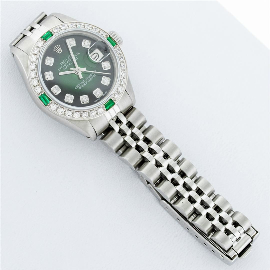 One Ladies Stainless Steel Rolex Datejust Polished Bright with Satin Finish, Serviced & Electronically Tested, Stainless Steel Case: 26mm, Stainless Steel Crown, Custom Bezel: New 18K White Gold Emerald Beadset Diamond Bezel, Diamond + Gem Count: 28 Diamonds + 4 Emeralds Total Weight .70 Carat, Clarity: SI-VS, Color: G to H. Custom Crystal: New Synthetic Sapphire Cyclops Lens. Custom Hands: New Luminescent Hands. Movement: Automatic Winding Movement. Custom Dial: Refinished Green Vignette With Diamond Hour Markers. Diamond Count: 10 Diamonds In Dial, Clarity: SI-VS, Color: G to H. Date Window: 3 O'Clock Position Date Display, Model: Datejust. Condition: G-6 Extra Fine. Bracelet: Stainless Steel Jubilee. Bright Polish & Satin Finish. 6.0 Inch Length, Adjustable. Standard Clasp, With Rolex Logo. This Watch Has Been Serviced Time Tested And Is In Excellent Condition It Is Free Of All Scratches And Dents.