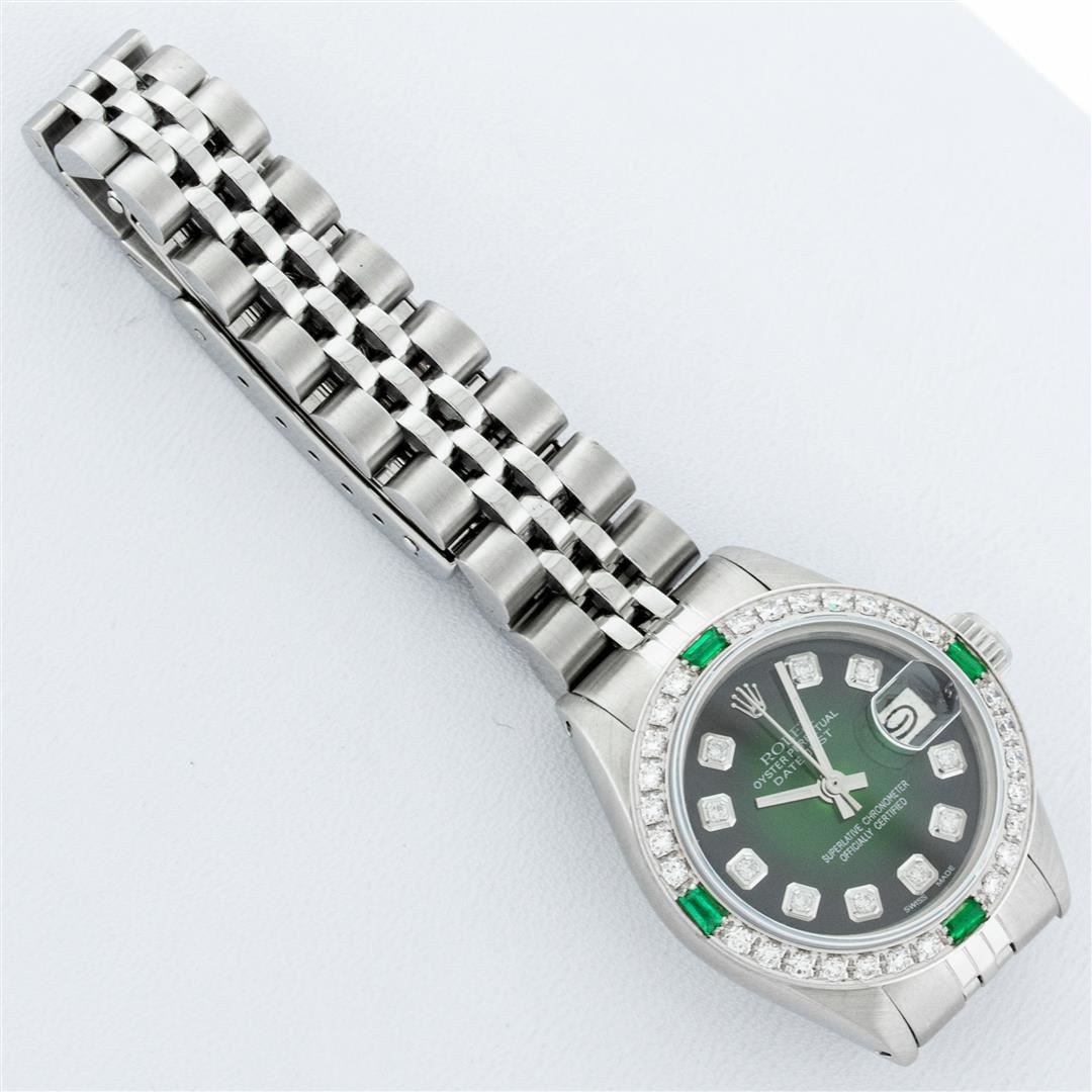 One Ladies Stainless Steel Rolex Datejust Polished Bright with Satin Finish, Serviced & Electronically Tested, Stainless Steel Case: 26mm, Stainless Steel Crown, Custom Bezel: New 18K White Gold Emerald Beadset Diamond Bezel, Diamond + Gem Count: 28 Diamonds + 4 Emeralds Total Weight .70 Carat, Clarity: SI-VS, Color: G to H. Custom Crystal: New Synthetic Sapphire Cyclops Lens. Custom Hands: New Luminescent Hands. Movement: Automatic Winding Movement. Custom Dial: Refinished Green Vignette With Diamond Hour Markers. Diamond Count: 10 Diamonds In Dial, Clarity: SI-VS, Color: G to H. Date Window: 3 O'Clock Position Date Display, Model: Datejust. Condition: G-6 Extra Fine. Bracelet: Stainless Steel Jubilee. Bright Polish & Satin Finish. 6.0 Inch Length, Adjustable. Standard Clasp, With Rolex Logo. This Watch Has Been Serviced Time Tested And Is In Excellent Condition It Is Free Of All Scratches And Dents.