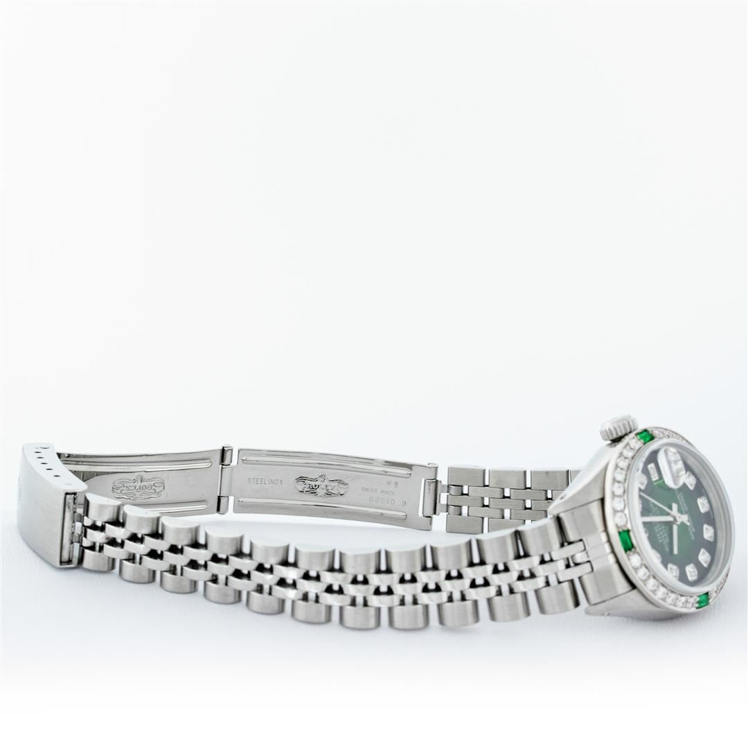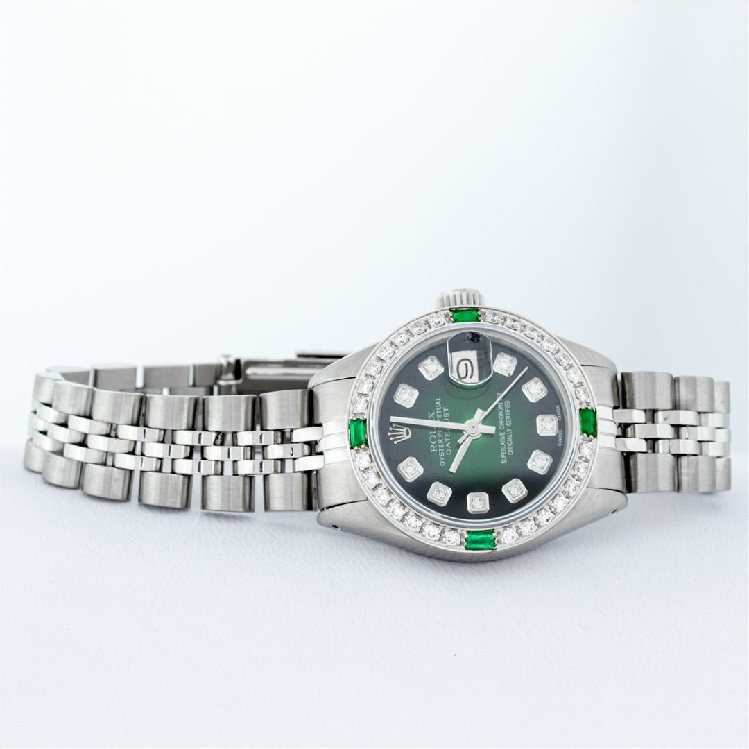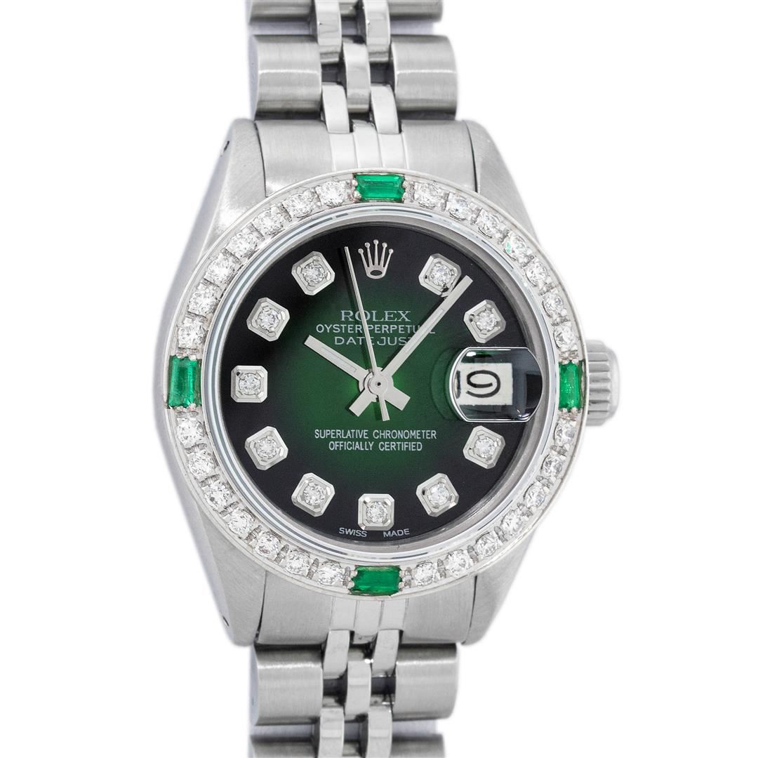 One Ladies Stainless Steel Rolex Datejust Polished Bright with Satin Finish, Serviced & Electronically Tested, Stainless Steel Case: 26mm, Stainless Steel Crown, Custom Bezel: New 18K White Gold Emerald Beadset Diamond Bezel, Diamond + Gem Count: 28 Diamonds + 4 Emeralds Total Weight .70 Carat, Clarity: SI-VS, Color: G to H. Custom Crystal: New Synthetic Sapphire Cyclops Lens. Custom Hands: New Luminescent Hands. Movement: Automatic Winding Movement. Custom Dial: Refinished Green Vignette With Diamond Hour Markers. Diamond Count: 10 Diamonds In Dial, Clarity: SI-VS, Color: G to H. Date Window: 3 O'Clock Position Date Display, Model: Datejust. Condition: G-6 Extra Fine. Bracelet: Stainless Steel Jubilee. Bright Polish & Satin Finish. 6.0 Inch Length, Adjustable. Standard Clasp, With Rolex Logo. This Watch Has Been Serviced Time Tested And Is In Excellent Condition It Is Free Of All Scratches And Dents.