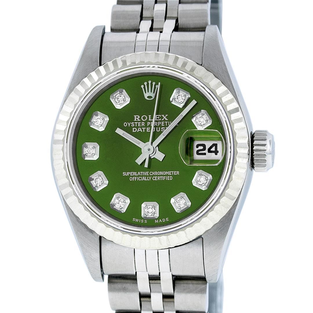 One Ladies Quickset Stainless Steel Rolex Datejust Polished Bright with Satin Finish, Serviced & Electronically Tested, Stainless Steel Case: 26mm, Stainless Steel Crown, Bezel: 18K White Gold Fluted Bezel. Custom Crystal: New Scratch Resistant Sapphire Cyclops Lens. Custom Hands: New Luminescent Hands. Movement: Automatic Winding Movement Caliber 2235. Custom Dial: Green Diamond Dial, Diamond Count: 10 Diamonds In Dial, Color: G to H, Clarity: SI1 Date Window: 3 O'Clock Position Date Display, Model: 79174 Quickset Datejust. Condition: G-6 Extra Fine. Bracelet: Stainless Steel Jubilee Band. Bright Polish & Satin Finish. 6.0 Inch Length, Adjustable. Standard Clasp, With Rolex Logo. This Watch Has Been Serviced Time Tested And Is In Excellent Condition It Is Free Of All Scratches And Dents.