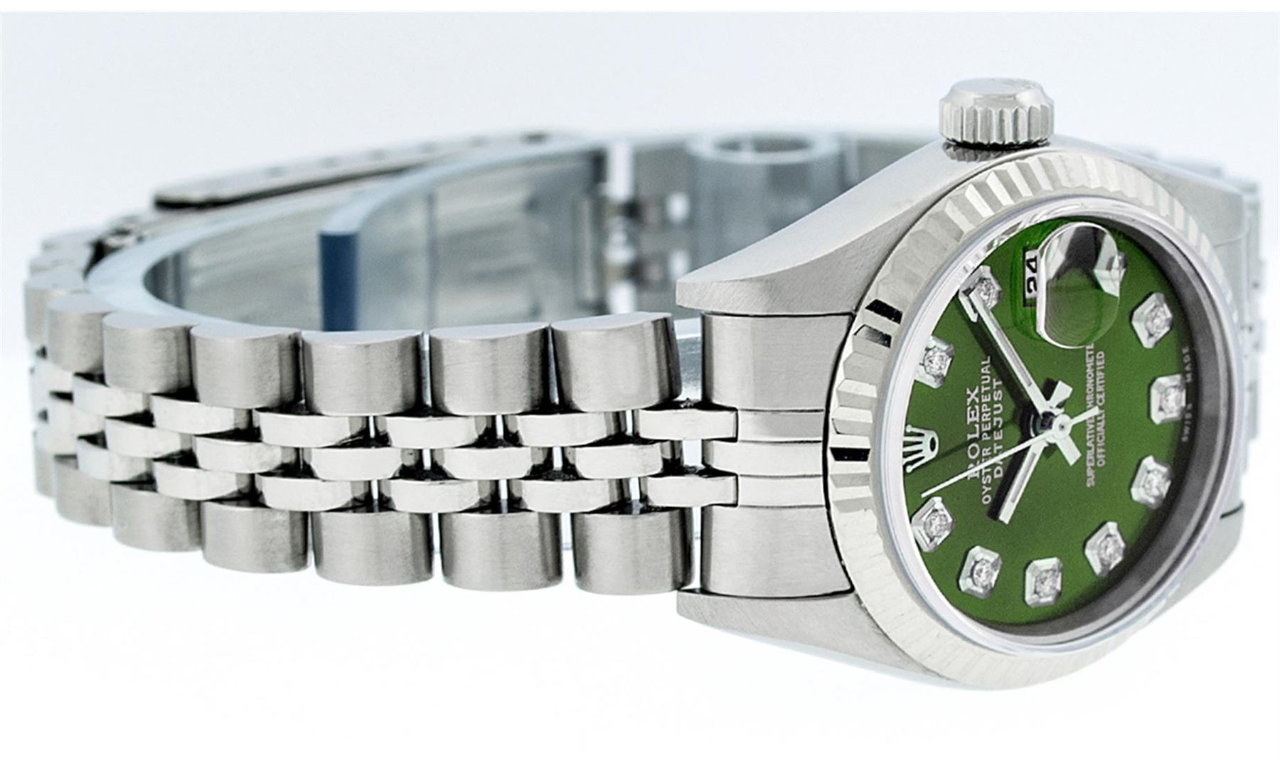 One Ladies Quickset Stainless Steel Rolex Datejust Polished Bright with Satin Finish, Serviced & Electronically Tested, Stainless Steel Case: 26mm, Stainless Steel Crown, Bezel: 18K White Gold Fluted Bezel. Custom Crystal: New Scratch Resistant Sapphire Cyclops Lens. Custom Hands: New Luminescent Hands. Movement: Automatic Winding Movement Caliber 2235. Custom Dial: Green Diamond Dial, Diamond Count: 10 Diamonds In Dial, Color: G to H, Clarity: SI1 Date Window: 3 O'Clock Position Date Display, Model: 79174 Quickset Datejust. Condition: G-6 Extra Fine. Bracelet: Stainless Steel Jubilee Band. Bright Polish & Satin Finish. 6.0 Inch Length, Adjustable. Standard Clasp, With Rolex Logo. This Watch Has Been Serviced Time Tested And Is In Excellent Condition It Is Free Of All Scratches And Dents.