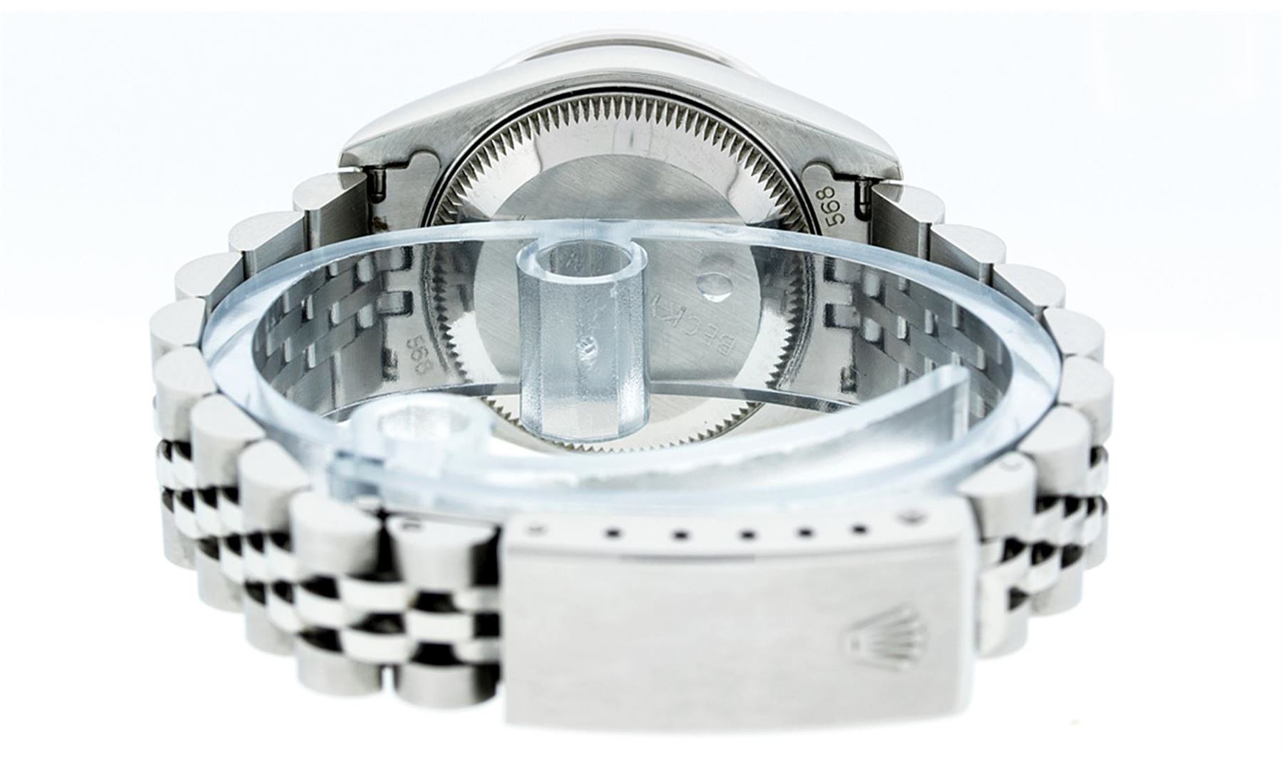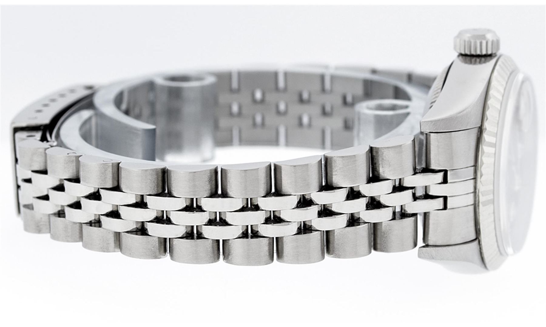 One Ladies Quickset Stainless Steel Rolex Datejust Polished Bright with Satin Finish, Serviced & Electronically Tested, Stainless Steel Case: 26mm, Stainless Steel Crown, Bezel: 18K White Gold Fluted Bezel. Custom Crystal: New Scratch Resistant Sapphire Cyclops Lens. Custom Hands: New Luminescent Hands. Movement: Automatic Winding Movement Caliber 2235. Custom Dial: Green Diamond Dial, Diamond Count: 10 Diamonds In Dial, Color: G to H, Clarity: SI1 Date Window: 3 O'Clock Position Date Display, Model: 79174 Quickset Datejust. Condition: G-6 Extra Fine. Bracelet: Stainless Steel Jubilee Band. Bright Polish & Satin Finish. 6.0 Inch Length, Adjustable. Standard Clasp, With Rolex Logo. This Watch Has Been Serviced Time Tested And Is In Excellent Condition It Is Free Of All Scratches And Dents.