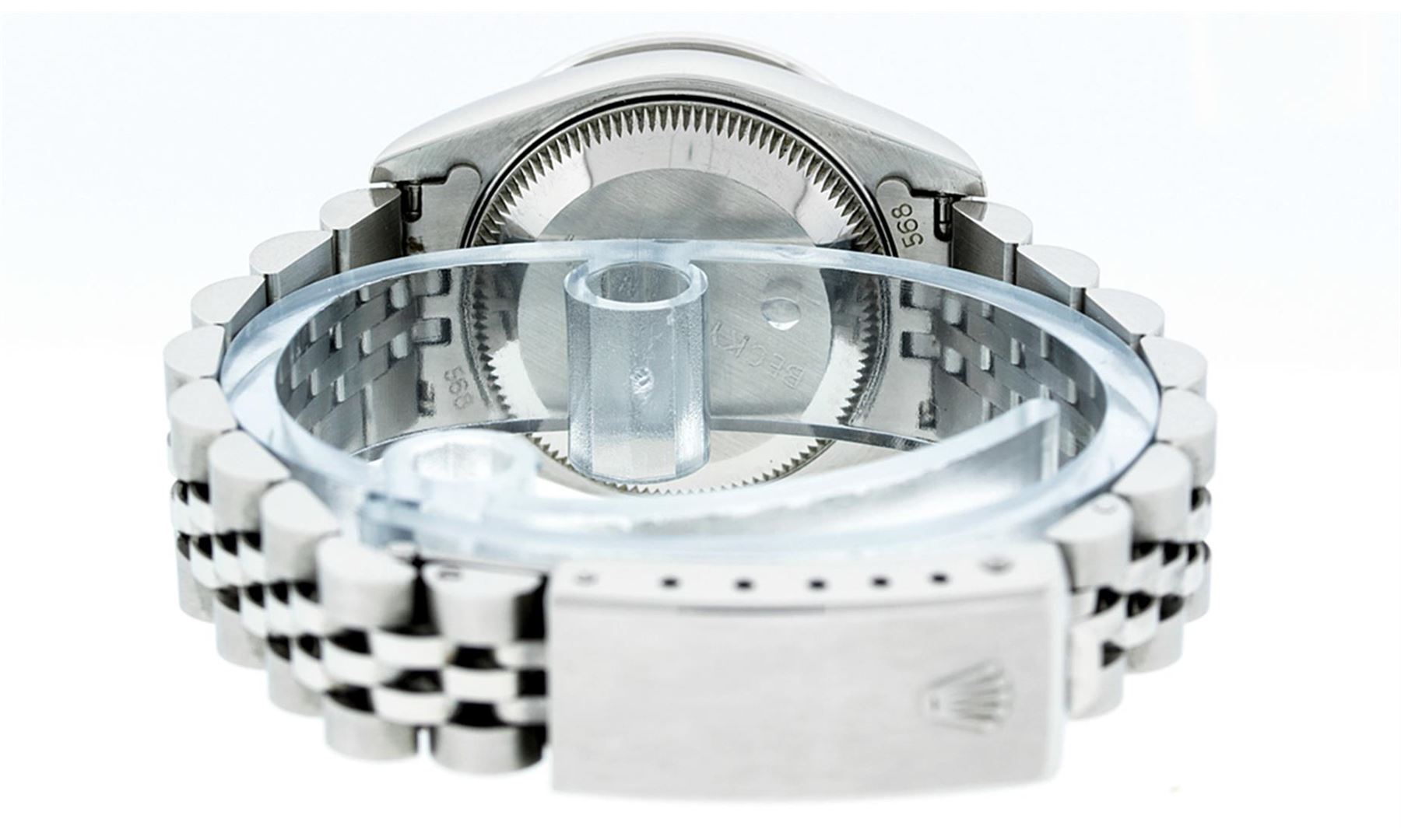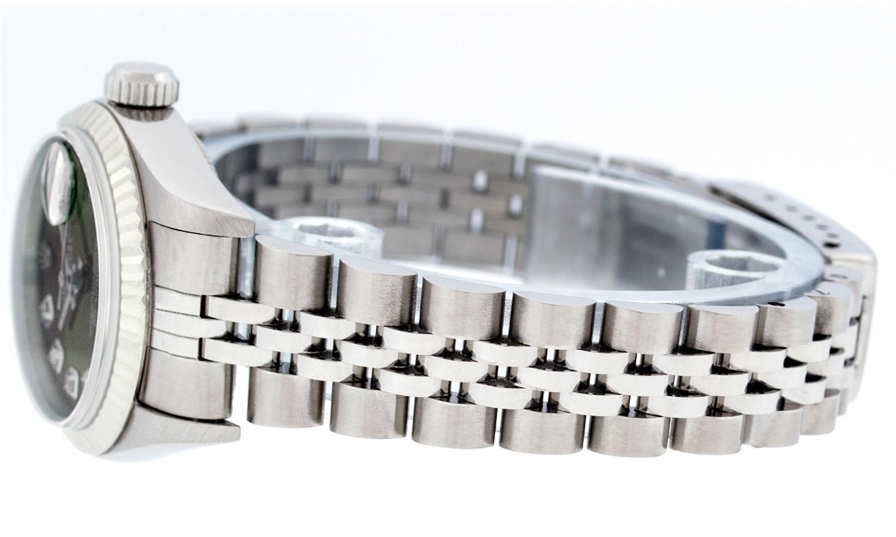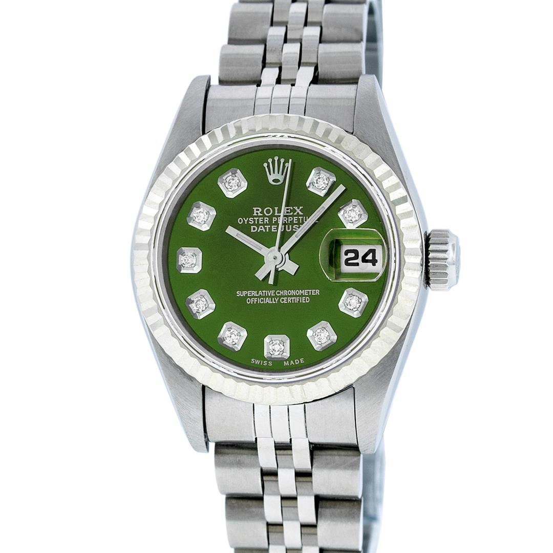 One Ladies Pre Owned Quickset Stainless Steel Rolex Oyster Perpetual Datejust Polished Bright with Satin Finish, Serviced & Electronically Tested, Rolex Stainless Steel Case: 26mm, Rolex Stainless Steel Crown, Rolex Bezel: 18K White Gold Fluted Bezel. Custom Crystal: New Scratch Resistant Sapphire Cyclops Lens. Custom Hands: New Luminescent Hands. Rolex Movement: Automatic Winding Movement. Custom Dial: Refinished To Green With Custom Added Genuine Diamonds, Diamond Count: 10 Diamonds In Dial, Color: G to H, Clarity: SI1 Date Window: 3 O'clock Position Date Display, Model: Quickset Datejust. Condition: G-6 Extra Fine. Rolex Bracelet: Stainless Steel Jubilee Band. Bright Polish & Satin Finish. 6.0 Inch Length, Adjustable. Standard Clasp, With Rolex Logo. This Watch Has Been Serviced Time Tested And Is In Excellent Condition It Is Free Of All Scratches And Dents.