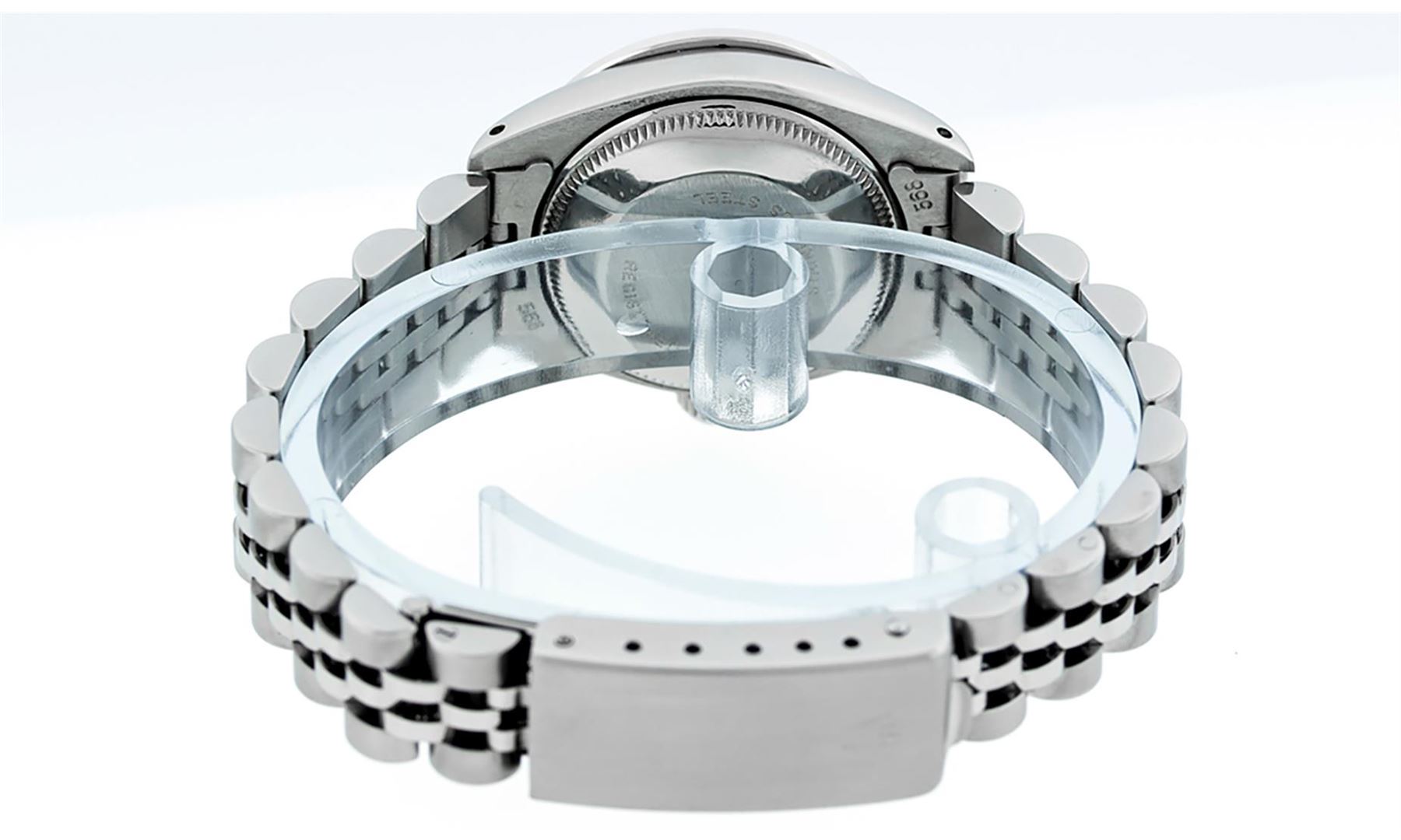 One Ladies Stainless Steel Rolex Datejust Polished Bright with Satin Finish, Serviced & Electronically Tested, Stainless Steel Case: 26mm, Stainless Steel Crown. Custom Bezel: New 18K White Gold Beadset & Emerald Diamond Bezel, Diamond Count: 28 Diamonds + 4 Emeralds. Total Weight .70 Carat, Clarity: SI-VS, Color: G to H. Custom Crystal: New Synthetic Sapphire Cyclops Lens. Custom Hands: New Luminescent Hands. Movement: Automatic Winding Movement Caliber 2030. Custom Dial: Refinished Green Mother Of Pearl Diamond Dial, Stone Count: 10 Diamonds In Dial, G To H In Color, Clarity: SI-VS. Date Window: 3 O'clock Position Date Display, Model: Datejust. Condition: G-6 Extra Fine. Bracelet: Stainless Steel Jubilee. Bright Polish & Satin Finish. 6.0 Inch Length, Adjustable. Standard Clasp, With Rolex Logo. This Watch Has Been Serviced Time Tested And Is In Excellent Condition It Is Free Of All Scratches And Dents.