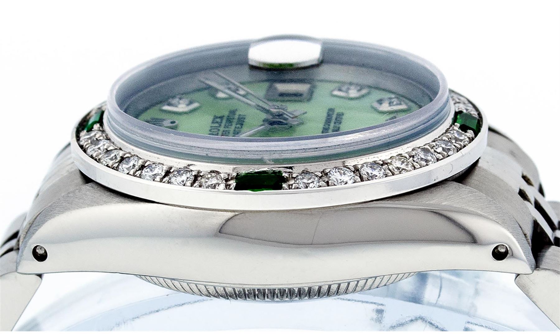 One Ladies Stainless Steel Rolex Datejust Polished Bright with Satin Finish, Serviced & Electronically Tested, Stainless Steel Case: 26mm, Stainless Steel Crown. Custom Bezel: New 18K White Gold Beadset & Synthetic Emerald Diamond Bezel, Diamond Count: 28 Diamonds + 4 Synthetic Emeralds. Total Weight .70 Carat, Clarity: SI-VS, Color: G to H. Custom Crystal: New Synthetic Sapphire Cyclops Lens. Custom Hands: New Luminescent Hands. Movement: Automatic Winding Movement. Custom Dial: Refinished Green Mother Of Pearl Diamond Dial, Stone Count: 10 Diamonds In Dial, G To H In Color, Clarity: SI-VS. Date Window: 3 O'clock Position Date Display, Model: Datejust. Condition: G-6 Extra Fine. Bracelet: Stainless Steel Jubilee. Bright Polish & Satin Finish. 6.0 Inch Length, Adjustable. Standard Clasp, With Rolex Logo. This Watch Has Been Serviced Time Tested And Is In Excellent Condition It Is Free Of All Scratches And Dents.