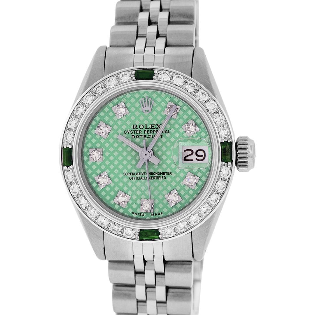 One Ladies Stainless Steel Rolex Datejust Polished Bright with Satin Finish, Serviced & Electronically Tested, Stainless Steel Case: 26mm, Stainless Steel Crown, Custom Bezel: New 18K White Emerald Beadset Diamond Bezel, Diamond + Gem Count: 28 Diamonds + 4 Emeralds. Total Weight .70 Carat, Clarity: SI-VS, Color: G to H. Custom Crystal: New Scratch Resistant Synthetic Sapphire Cyclops Lens. Custom Hands: New Luminescent Hands. Movement: Automatic Winding Movement Caliber 2030. Custom Dial: Green Stamp With Single Cut Diamond Hour Markers, 10 Diamonds in Dial, G To H In Color, Clarity: SI-VS. Date Window: 3 O'Clock Position Date Display, Model: Datejust. Condition: G-6 Extra Fine. Bracelet: Stainless Steel Jubilee Band. Bright Polish & Satin Finish. 6.0 Inch Length, Adjustable. Standard Clasp, With Rolex Logo. This Watch Has Been Serviced Time Tested And Is In Excellent Condition It Is Free Of All Scratches And Dents.