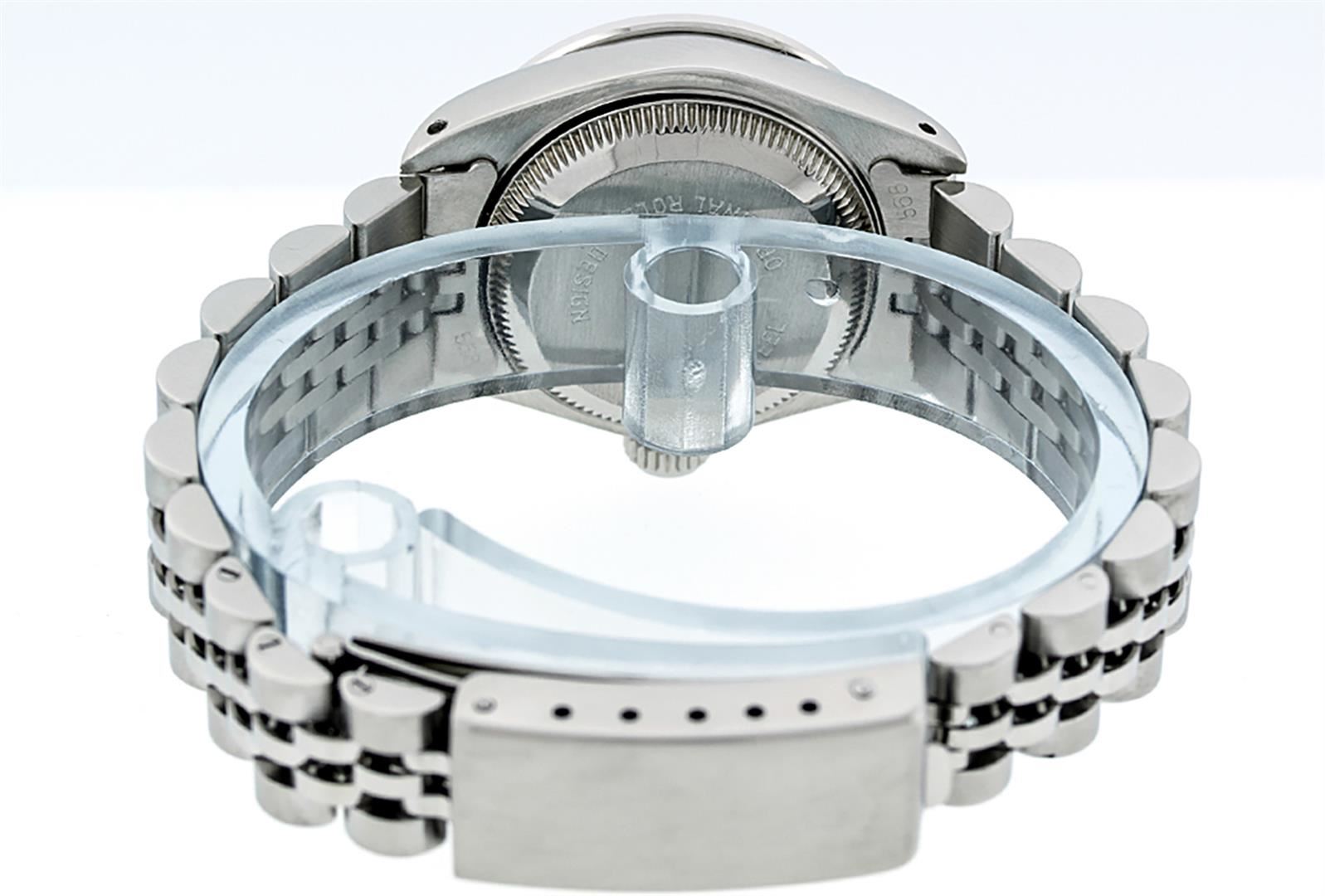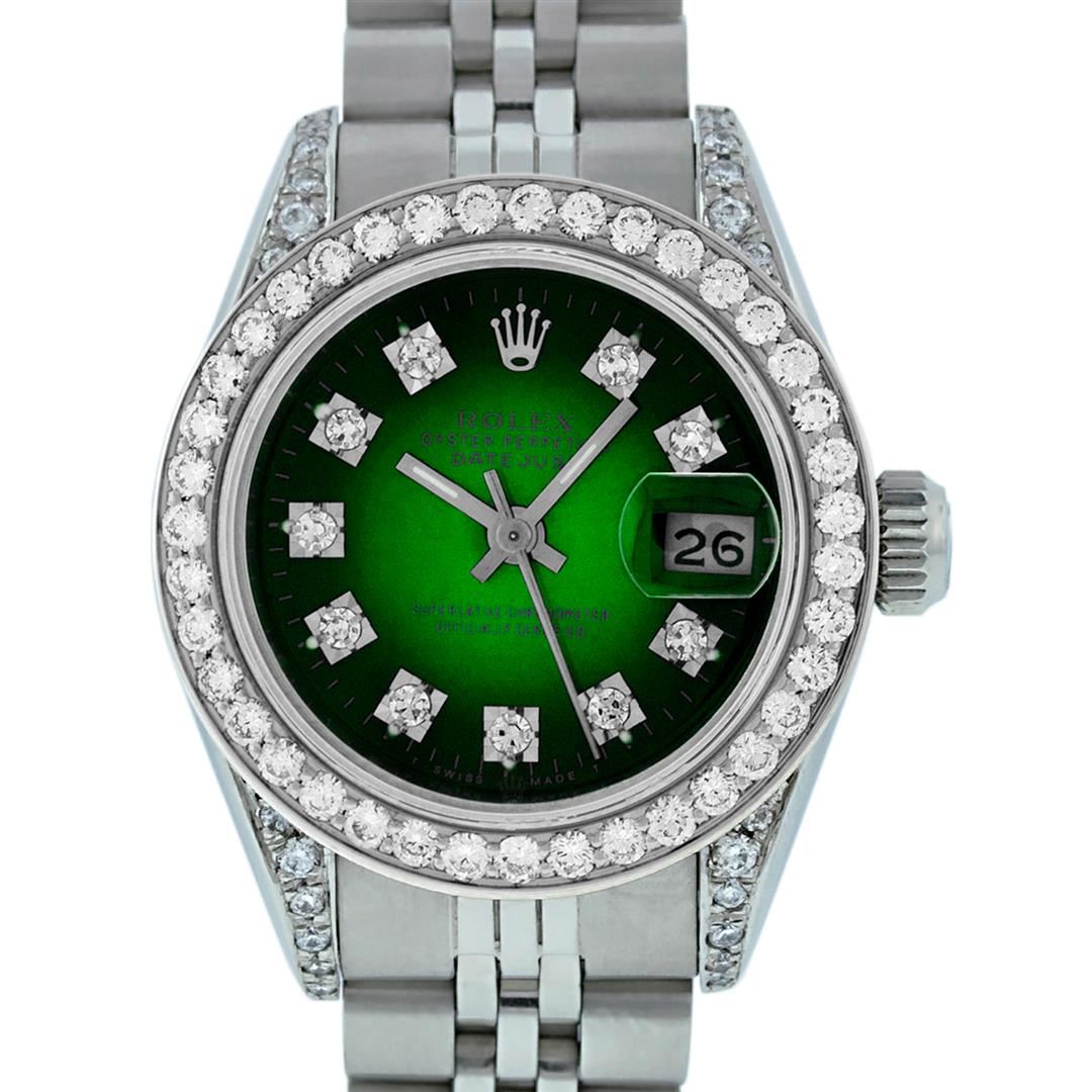 One Ladies Stainless Steel Rolex Datejust Polished Bright with Satin Finish, Serviced & Electronically Tested, Stainless Steel Case: 26mm, Stainless Steel Crown, Diamond Lugs: 24 Diamonds On Lugs, Clarity: SI-VS, Color: G to H. Custom Bezel: New Stainless Steel Diamond Beadset Bezel, Diamond Count: 39 Diamonds On Bezel, Total Weight .70 Carat, Clarity: SI-VS, Color: G to H. Custom Crystal: New Scratch Resistant Synthetic Sapphire Cyclops Lens. Custom Hands: New Luminescent Hands. Movement: Automatic Winding Movement. Custom Dial: Refinished Green Vignette Diamond Dial, 10 Diamonds in Dial, G To H In Color, Clarity: SI-VS. Date Window: 3 O'clock Position Date Display, Model: Datejust Condition: G-6 Extra Fine. Bracelet: Stainless Steel Jubilee Band. Bright Polish & Satin Finish. 6.0 Inch Length, Adjustable. Standard Clasp, With Rolex Logo. This Watch Has Been Serviced Time Tested And Is In Excellent Condition It Is Free Of All Scratches And Dents.