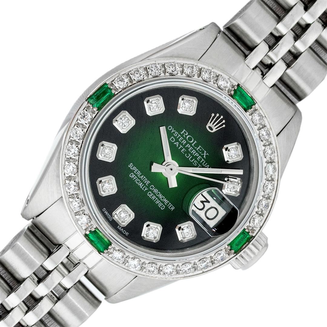 One Ladies Stainless Steel Rolex Datejust Polished Bright with Satin Finish, Serviced & Electronically Tested, Rolex Stainless Steel Case: 26mm, Rolex Stainless Steel Crown, Custom Bezel: New 18K White Gold Emerald Beadset Diamond Bezel, Diamond + Gem Count: 28 Diamonds + 4 Emeralds Total Weight .70 Carat, Clarity: SI-VS, Color: G to H. Custom Crystal: New Sapphire With Magnified Date Window. Custom Hands: New Luminescent Hands. Rolex Movement: Automatic Winding Movement. Custom Dial: Refinished To Green With Added Diamond Hour Markers. Diamond Count: 10 Diamonds In Dial, Clarity: SI-VS, Color: G to H. Date Window: 3 O'clock Position Date Display, Model: Datejust. Condition: G-6 Extra Fine. Rolex Bracelet: Stainless Steel Jubilee Band. Bright Polish & Satin Finish. 6.0 Inch Length, Adjustable. Standard Clasp, With Rolex Logo. This Pre Owned Watch Has Been Serviced Time Tested And Is In Excellent Condition It Is Free Of All Scratches And Dents. This Watch Comes With A Rolex Box.