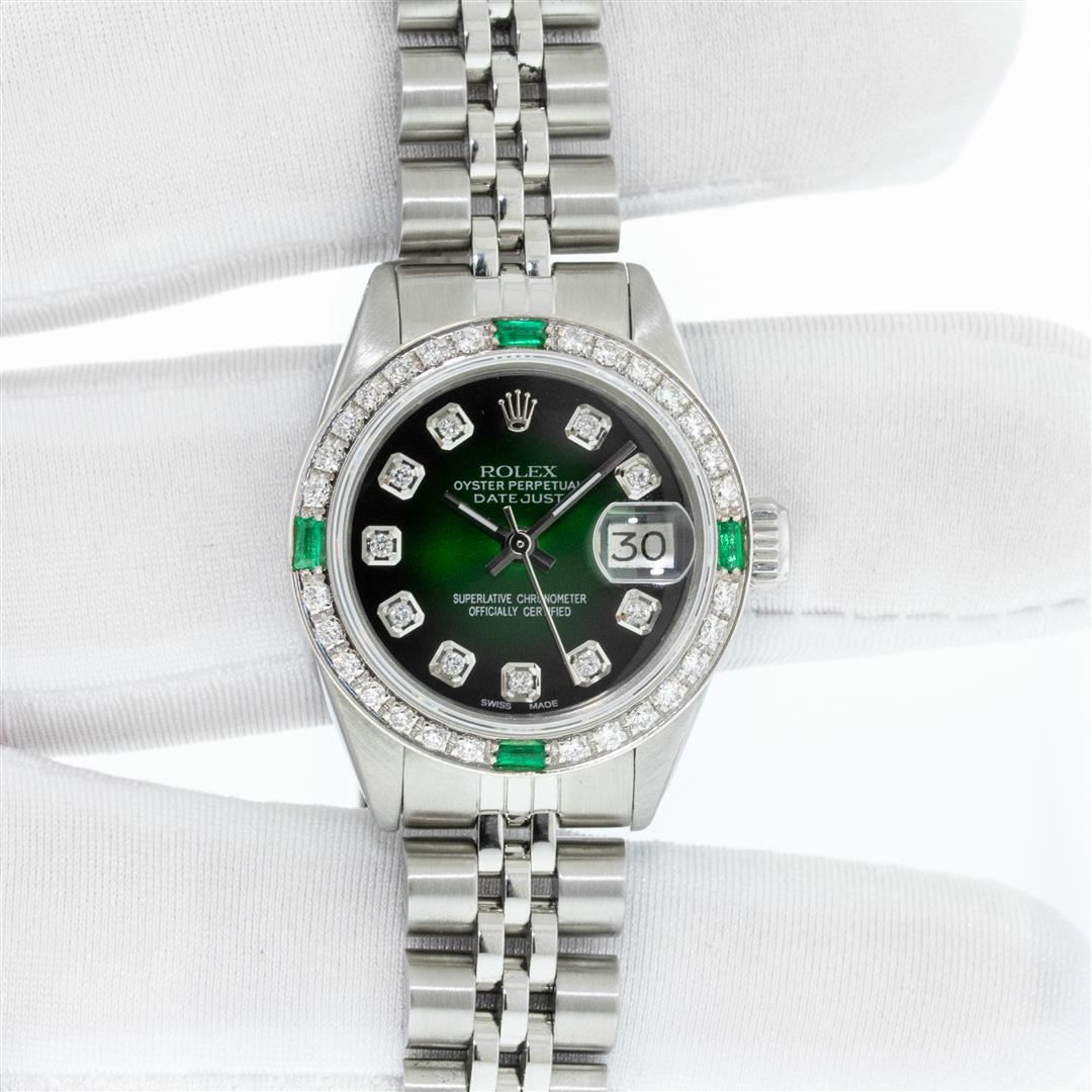 One Ladies Stainless Steel Rolex Datejust Polished Bright with Satin Finish, Serviced & Electronically Tested, Rolex Stainless Steel Case: 26mm, Rolex Stainless Steel Crown, Custom Bezel: New 18K White Gold Emerald Beadset Diamond Bezel, Diamond + Gem Count: 28 Diamonds + 4 Emeralds Total Weight .70 Carat, Clarity: SI-VS, Color: G to H. Custom Crystal: New Sapphire With Magnified Date Window. Custom Hands: New Luminescent Hands. Rolex Movement: Automatic Winding Movement. Custom Dial: Refinished To Green With Added Diamond Hour Markers. Diamond Count: 10 Diamonds In Dial, Clarity: SI-VS, Color: G to H. Date Window: 3 O'clock Position Date Display, Model: Datejust. Condition: G-6 Extra Fine. Rolex Bracelet: Stainless Steel Jubilee Band. Bright Polish & Satin Finish. 6.0 Inch Length, Adjustable. Standard Clasp, With Rolex Logo. This Pre Owned Watch Has Been Serviced Time Tested And Is In Excellent Condition It Is Free Of All Scratches And Dents. This Watch Comes With A Rolex Box.