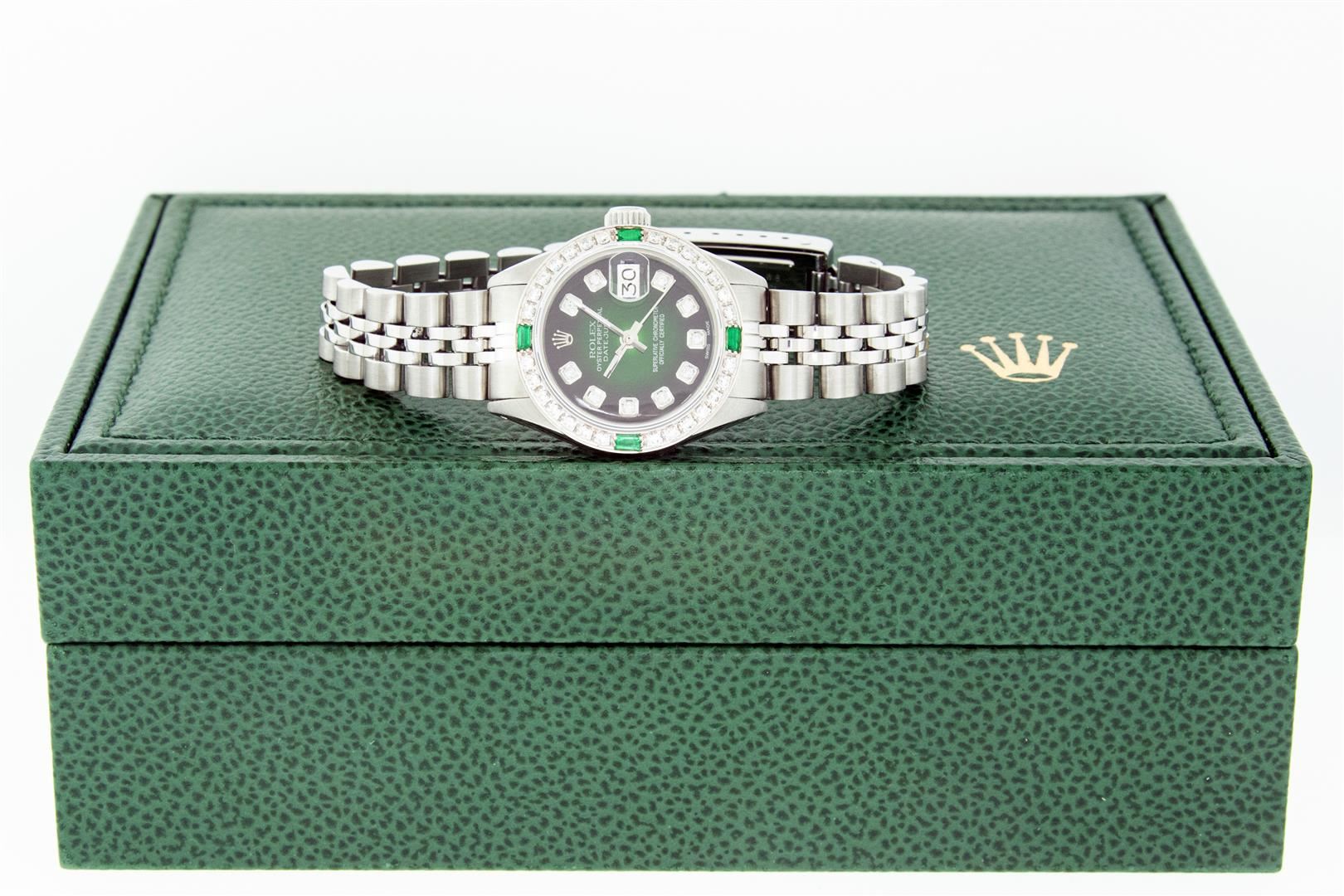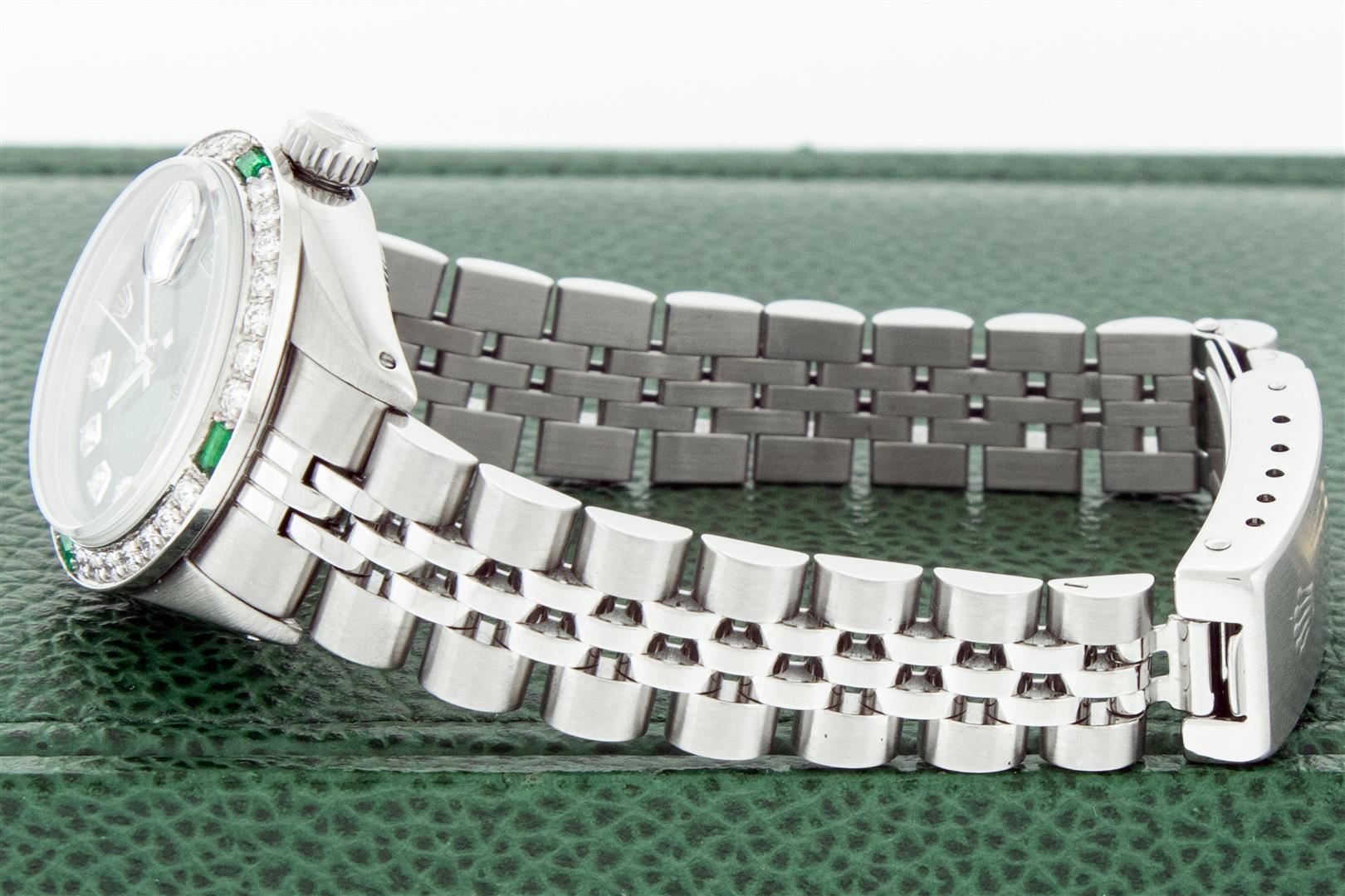 One Ladies Stainless Steel Rolex Datejust Polished Bright with Satin Finish, Serviced & Electronically Tested, Rolex Stainless Steel Case: 26mm, Rolex Stainless Steel Crown, Custom Bezel: New 18K White Gold Emerald Beadset Diamond Bezel, Diamond + Gem Count: 28 Diamonds + 4 Emeralds Total Weight .70 Carat, Clarity: SI-VS, Color: G to H. Custom Crystal: New Sapphire With Magnified Date Window. Custom Hands: New Luminescent Hands. Rolex Movement: Automatic Winding Movement. Custom Dial: Refinished To Green With Added Diamond Hour Markers. Diamond Count: 10 Diamonds In Dial, Clarity: SI-VS, Color: G to H. Date Window: 3 O'clock Position Date Display, Model: Datejust. Condition: G-6 Extra Fine. Rolex Bracelet: Stainless Steel Jubilee Band. Bright Polish & Satin Finish. 6.0 Inch Length, Adjustable. Standard Clasp, With Rolex Logo. This Pre Owned Watch Has Been Serviced Time Tested And Is In Excellent Condition It Is Free Of All Scratches And Dents. This Watch Comes With A Rolex Box.