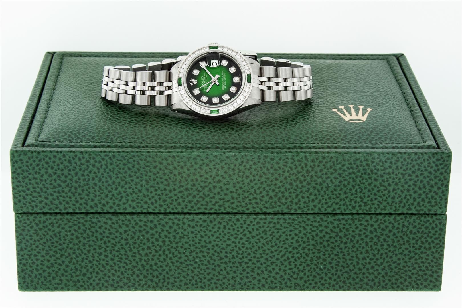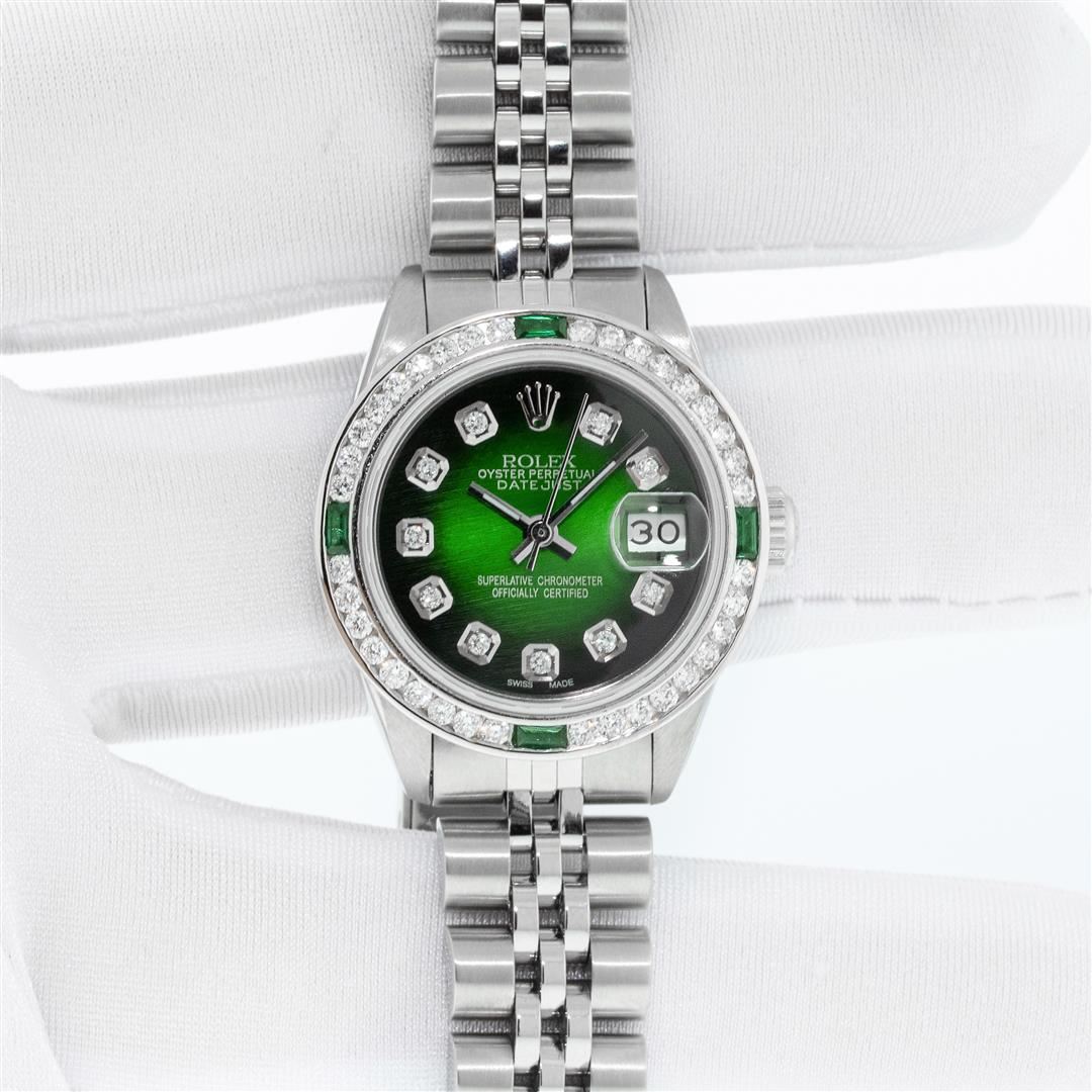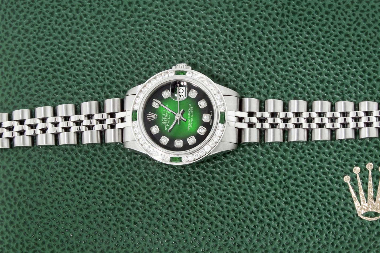 One Ladies Stainless Steel Rolex Datejust Polished Bright with Satin Finish, Serviced & Electronically Tested, Stainless Steel Case: 26mm, Stainless Steel Crown, Custom Bezel: New 18K White Gold Emerald Channel Set Diamond Bezel, Diamond + Gem Count: 36 Diamonds + 4 Emerald Total Weight 1.00 Carat, Clarity: SI-VS, Color: G to H. Custom Crystal: New Sapphire With Date Window. Custom Hands: New Luminescent Hands. Rolex Movement: Automatic Winding Movement. Custom Dial: Refinished To Green Vignette With Diamond Hour Markers. Date Window: 3 O'Clock Position Date Display, Model: Datejust. Condition: G-6 Extra Fine. Rolex Bracelet: Stainless Steel Jubilee Band. Bright Polish & Saiin Finish. 6.0 Inch Length, Adjustable. Standard Clasp, With Rolex Logo. This Watch Has Been Serviced Time Tested And Is In Excellent Condition It Is Free Of All Scratches And Dents. This Watch Comes With A Rolex Box.