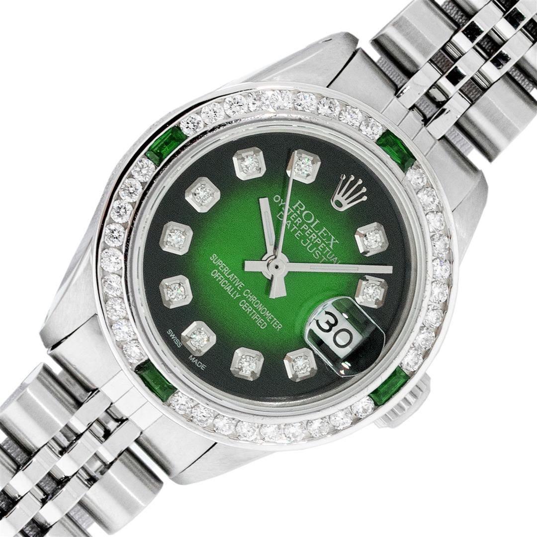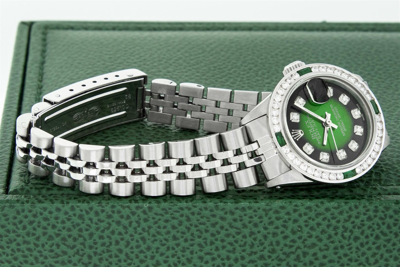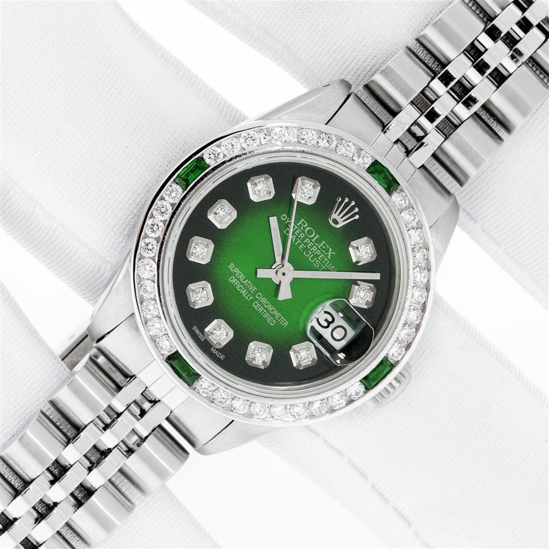 One Ladies Stainless Steel Rolex Datejust Polished Bright with Satin Finish, Serviced & Electronically Tested, Stainless Steel Case: 26mm, Stainless Steel Crown, Custom Bezel: New 18K White Gold Emerald Channel Set Diamond Bezel, Diamond + Gem Count: 36 Diamonds + 4 Emerald Total Weight 1.00 Carat, Clarity: SI-VS, Color: G to H. Custom Crystal: New Sapphire With Date Window. Custom Hands: New Luminescent Hands. Rolex Movement: Automatic Winding Movement. Custom Dial: Refinished To Green Vignette With Diamond Hour Markers. Date Window: 3 O'Clock Position Date Display, Model: Datejust. Condition: G-6 Extra Fine. Rolex Bracelet: Stainless Steel Jubilee Band. Bright Polish & Saiin Finish. 6.0 Inch Length, Adjustable. Standard Clasp, With Rolex Logo. This Watch Has Been Serviced Time Tested And Is In Excellent Condition It Is Free Of All Scratches And Dents. This Watch Comes With A Rolex Box.