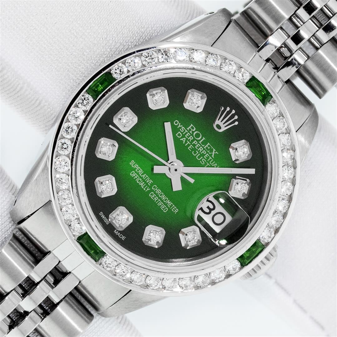 One Ladies Stainless Steel Rolex Datejust Polished Bright with Satin Finish, Serviced & Electronically Tested, Stainless Steel Case: 26mm, Stainless Steel Crown, Custom Bezel: New 18K White Gold Emerald Channel Set Diamond Bezel, Diamond + Gem Count: 36 Diamonds + 4 Emerald Total Weight 1.00 Carat, Clarity: SI-VS, Color: G to H. Custom Crystal: New Sapphire With Date Window. Custom Hands: New Luminescent Hands. Rolex Movement: Automatic Winding Movement. Custom Dial: Refinished To Green Vignette With Diamond Hour Markers. Date Window: 3 O'Clock Position Date Display, Model: Datejust. Condition: G-6 Extra Fine. Rolex Bracelet: Stainless Steel Jubilee Band. Bright Polish & Saiin Finish. 6.0 Inch Length, Adjustable. Standard Clasp, With Rolex Logo. This Watch Has Been Serviced Time Tested And Is In Excellent Condition It Is Free Of All Scratches And Dents. This Watch Comes With A Rolex Box.
