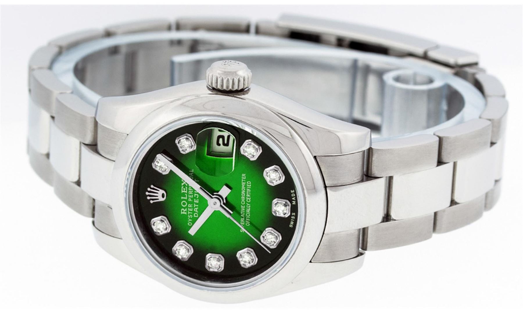 One Ladies Pre Owned Quickset Stainless Steel Rolex Datejust Polished Bright with Satin Finish, Serviced & Electronically Tested, Rolex Stainless Steel Case: 26mm, Rolex Stainless Steel Crown, Rolex Bezel: Stainless Steel Smooth Bezel. Custom Crystal: New Scratch Resistant Sapphire Cyclops Lens. Rolex Hands: Luminescent Hands. Rolex Movement: Automatic Winding Movement. Custom Dial: Refinished To Green Vignette With Custom Added Genuine Diamonds, Diamond Count: 10 Single Cut Diamonds In Dial, Color: G to H, Clarity: VS. Date Window: 3 O'clock Position Date Display, Model: Quickset Datejust. Condition: G-6 Extra Fine. Bracelet: Stainless Steel Oyster Band. Bright Polish & Satin Finish. 6.0 Inch Length, Adjustable. Standard Clasp, With Rolex Logo. This Watch Has Been Serviced Time Tested And Is In Excellent Condition It Is Free Of All Scratches And Dents.