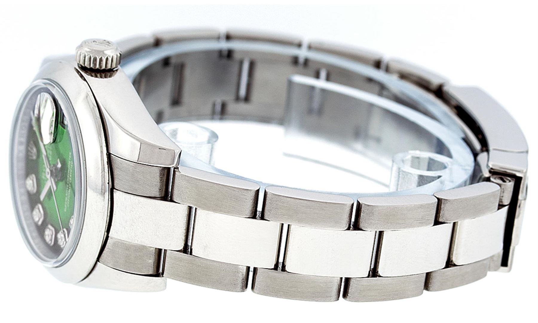 One Ladies Pre Owned Quickset Stainless Steel Rolex Datejust Polished Bright with Satin Finish, Serviced & Electronically Tested, Rolex Stainless Steel Case: 26mm, Rolex Stainless Steel Crown, Rolex Bezel: Stainless Steel Smooth Bezel. Custom Crystal: New Scratch Resistant Sapphire Cyclops Lens. Rolex Hands: Luminescent Hands. Rolex Movement: Automatic Winding Movement. Custom Dial: Refinished To Green Vignette With Custom Added Genuine Diamonds, Diamond Count: 10 Single Cut Diamonds In Dial, Color: G to H, Clarity: VS. Date Window: 3 O'clock Position Date Display, Model: Quickset Datejust. Condition: G-6 Extra Fine. Bracelet: Stainless Steel Oyster Band. Bright Polish & Satin Finish. 6.0 Inch Length, Adjustable. Standard Clasp, With Rolex Logo. This Watch Has Been Serviced Time Tested And Is In Excellent Condition It Is Free Of All Scratches And Dents.