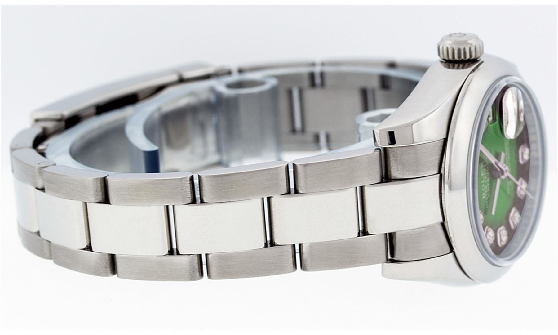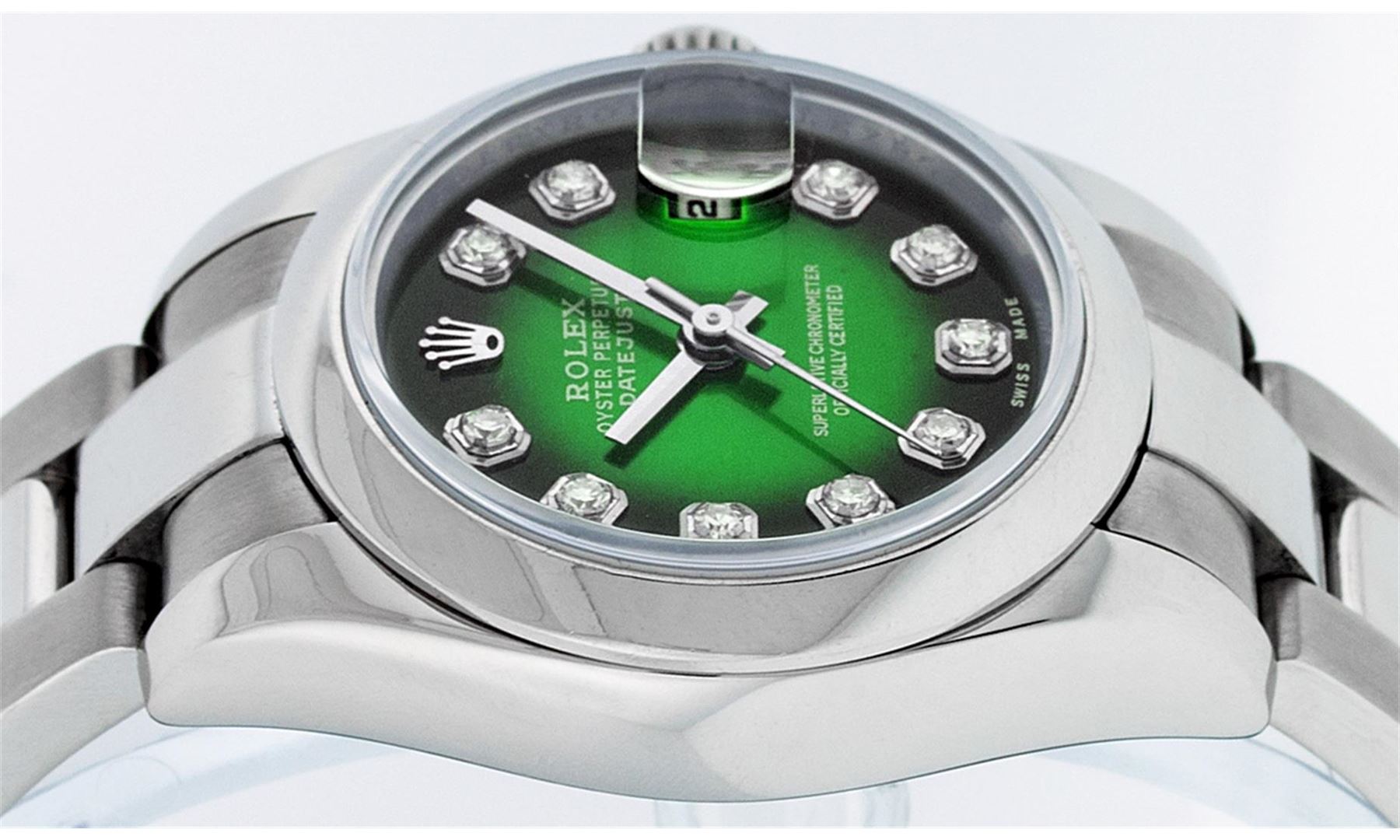 One Ladies Pre Owned Quickset Stainless Steel Rolex Datejust Polished Bright with Satin Finish, Serviced & Electronically Tested, Rolex Stainless Steel Case: 26mm, Rolex Stainless Steel Crown, Rolex Bezel: Stainless Steel Smooth Bezel. Custom Crystal: New Scratch Resistant Sapphire Cyclops Lens. Rolex Hands: Luminescent Hands. Rolex Movement: Automatic Winding Movement. Custom Dial: Refinished To Green Vignette With Custom Added Genuine Diamonds, Diamond Count: 10 Single Cut Diamonds In Dial, Color: G to H, Clarity: VS. Date Window: 3 O'clock Position Date Display, Model: Quickset Datejust. Condition: G-6 Extra Fine. Bracelet: Stainless Steel Oyster Band. Bright Polish & Satin Finish. 6.0 Inch Length, Adjustable. Standard Clasp, With Rolex Logo. This Watch Has Been Serviced Time Tested And Is In Excellent Condition It Is Free Of All Scratches And Dents.