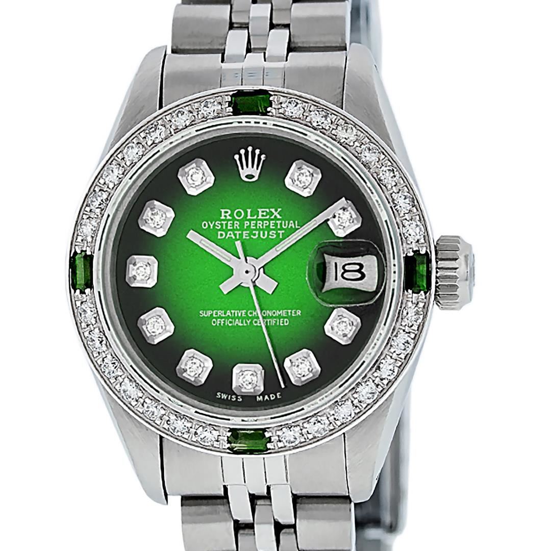 One Ladies Pre Owned Quickset Stainless Steel Rolex Datejust Polished Bright with Satin Finish, Serviced And Electronically Tested, Stainless Steel Case: 26mm, Stainless Steel Crown, Custom Bezel: New 18K White Gold Emerald Beadset Diamond Bezel, Diamond + Gem Count: 28 Diamonds + 4 Emeralds. Custom Crystal: New Sapphire With Date Window. Custom Hands: New Luminescent Hands. Rolex Movement: Automatic Winding Movement 2135. Custom Dial: Custom Green Vignette With Added Diamond Hour Markers. Diamond Count: 10 Diamonds On Dial. Date Window: 3 O'Clock Position Date Display, Model: Datejust. Condition: G-6 Extra Fine. Rolex Bracelet: Stainless Steel Jubilee Band. Bright Polish And Satin Finish. 6.0 Inch Length, Adjustable. Standard Clasp, With Rolex Logo. This Watch Has Been Serviced Time Tested And Is In Excellent Condition It Is Free Of All Scratches And Dents.